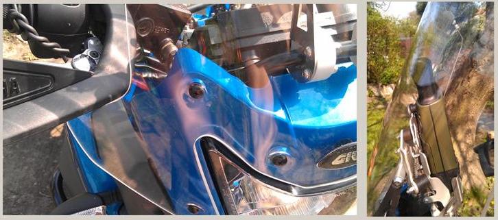 a) Moje Tenerka je vybavena originálními chrániči páček a blastery Yamaha a právě rozšíření plexi Givi v jeho spodní části brání natočení řidítek do krajních poloh - chybí tak 0,5 cm v každém bočním dorazu.