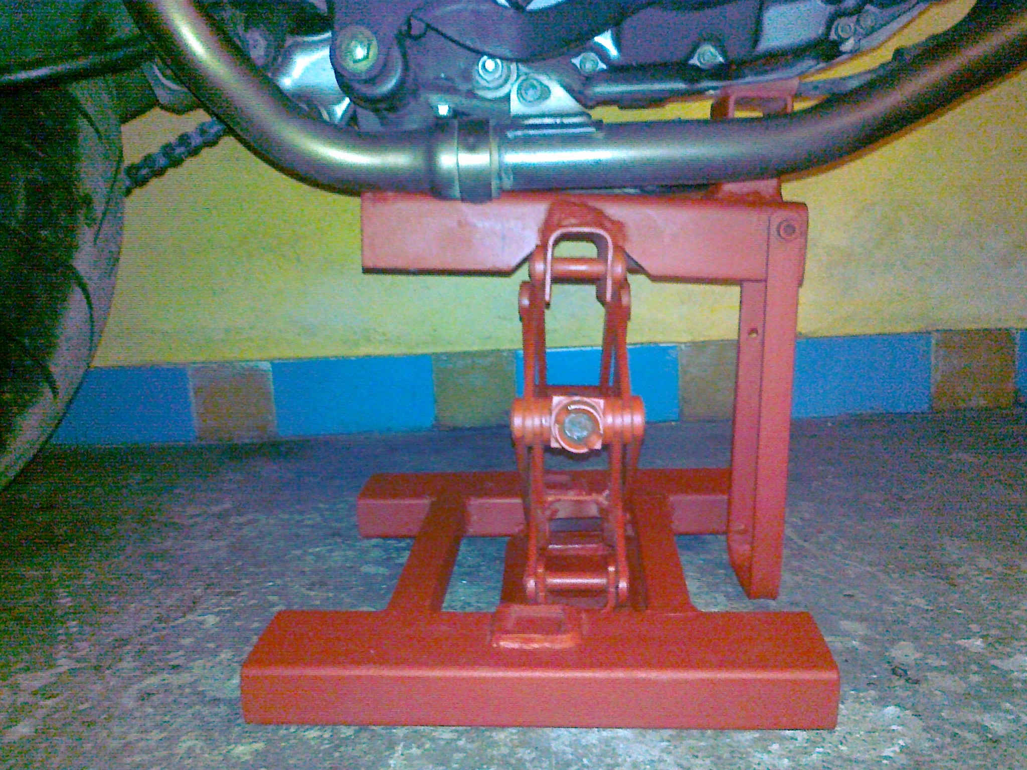 . Kámoš má doma ten stojan na enduro a ten je dost vysoký a pokládat mašinu na svody se mi fakt nechtělo... Udělal jsem podstavec, na který je navařený hever (trošku jsem ho zpevnil aby tolik nechodil do stran). Na hever je pak navařený U-profil, na jedné straně jsou matičky a šrouby kvůli upevnění k rámu mašiny místo centrálního stojanu a na druhé straně je podpěra s tlustým filcem, na kterou dosedá motor-je tam ze spodu na bloku taková ploška. Motorka na něm stabilně drží a obě kola jsou ve vzduchu. Jelikož je těžké uhodnout těžiště a navíc pod motorkou moc místa není, tak jsem tam přidělal v přední části jednoduchou opěrku...takže tak