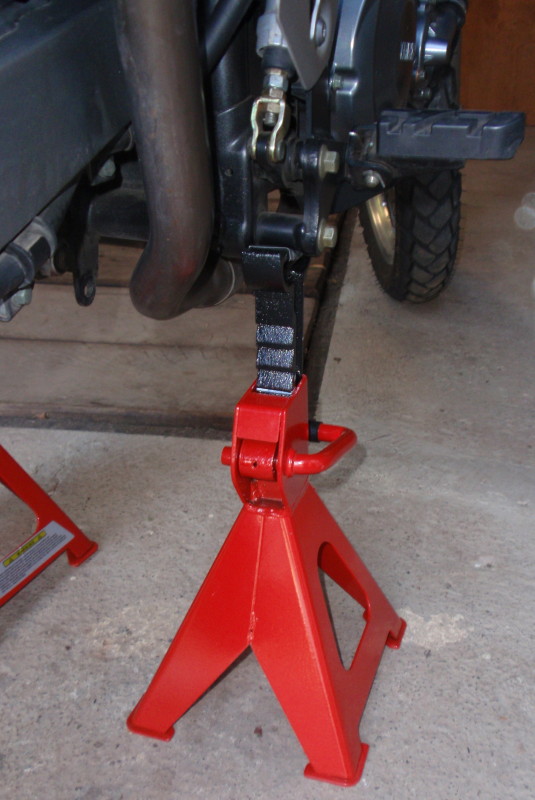 Nejdřív podložíš bočák třeba cihlou, nakloníš na něj, zasuneš jeden stojan, pak nakloníš na něj a vložíš druhý stojan. Oba přesně pasují pod stupačky, jen jsem je oblepil páskou aby nedřely lak. Jde to celkem snadno a je to pak velmi stabilní. Mohlo by to na tom stát klidně celou zimu a bylo by motce myslím líp, než když stojí na svodech.