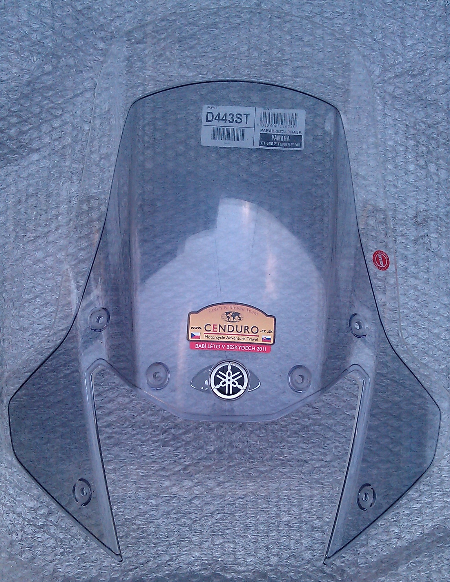 Jak je jasně vidět, byť na velmi špatné fotce, je o dost větší než originál Yamaha. Je o cosi širší ve spodní rozšířené části s těma "ušima", po celé délce je celkově širší od 5 do cca 8 cm, celkově je vyšší téměř o 10 cm. Na rozdíl od originálu je čiré, materiál je o zhruba 0,5 mm tenší a nemá tak výrazné "prolomení" po okrajích jako origo, spíše je jaksi plynule zaoblené. Předpokládám, že bude opravdu poskytovat lepší ochranu proti náporu vzduchu, lepší komfort při cestování. Proudění vzduchu okolo plexi a tedy i problém hluku v mojí Schuberth C3 však zůstává otázkou. Já jsem si totiž s tímto plexi D443ST od Givi nezajezdil ...