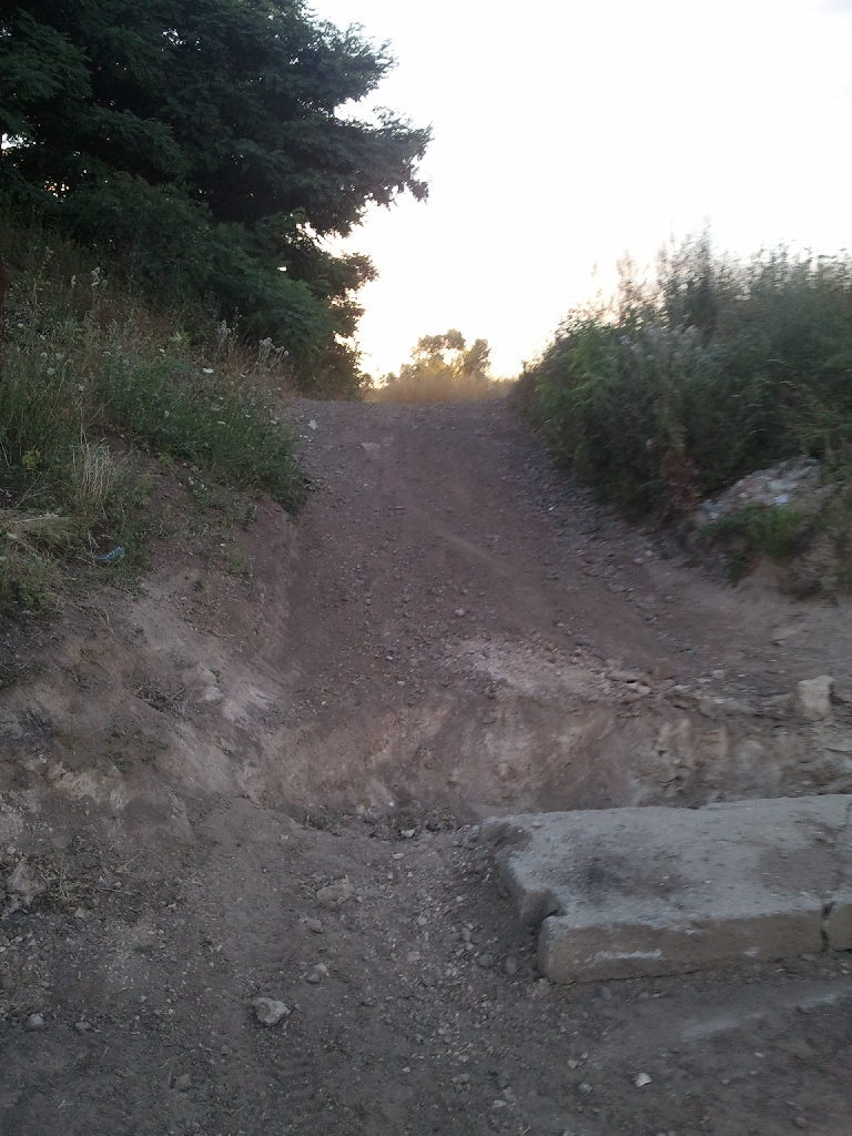 Přijel jsem od ulice Průmyslové a vyjížděl jsem u kruhovýho "objezdu". Ke kruháči se jede trošičku do kopce a kruháč je za horizontem po menším klesání dlouhým asi 20m. Jel jsem asi 30km/h a jakmile jsem se přenesl přes horizont, tak jsem si všiml, že nějaká ku...va vykopala bagrem přes celou šířku cesty asi půl metru hlubokou jámu. Brzdy (toto celý místo vzniklo navážením jemnýho formovacího písku ze slévaren) a buď si lehnu na ten svah a nebo si dám elegantní salto přes přední kolo a zádama na asfalt. Vybral jsem si první možnost.