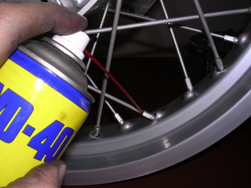 Každým niplem pootočit (povolit) a vrátit do původní polohy. Při tom jsem zjistil v předním kole pár volnějších drátů, tak jsem je přitáhl. Protože WD-40 nikde nevydrží moc dlouho, je dobré použít ještě něco na zakonzervování. Já jsem použil Wurth HHS2000 (můžete ho vidět v tématu "Maziva" na hlavní stránce) a přebytky opět utřel hadrem.