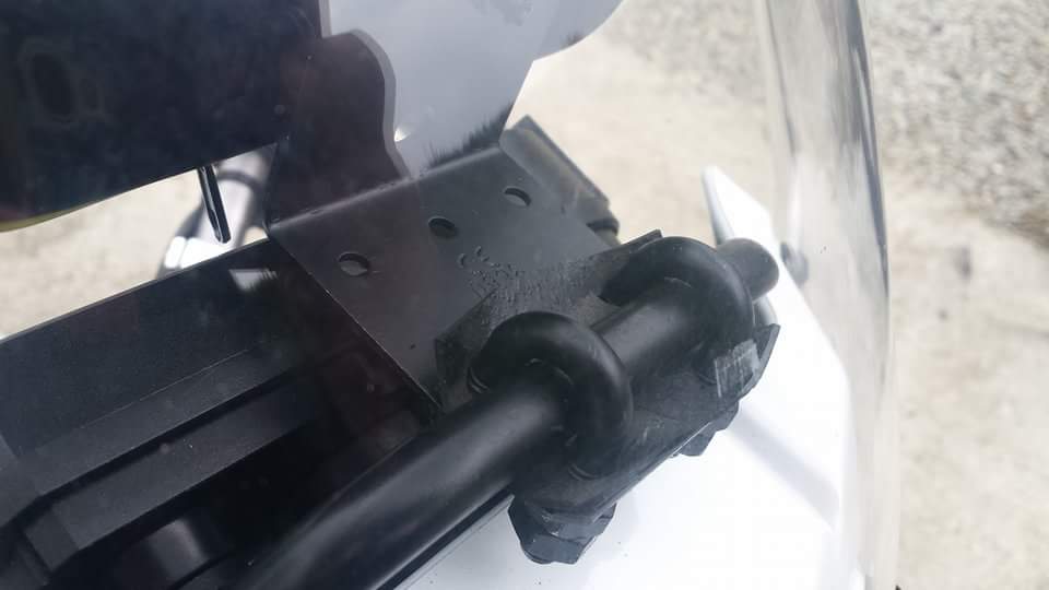 Takže jsem začal vymýšlet jak využít a zneužít tu hrazdu před plexi. Jak jsem psal výše, mám navigaci Garmin Nuvi 200 (na aukru jsem jí koupil za 700,- Kč), jako její velkou výhodu vidím malé rozměry, protože za tím plexi nepůsobí jak pěst na oko. Dokoupil jsem jeden držák do auta navíc (150,- Kč) klasická přísavka na sklo s kloubem a plastovým držákem - opět velmi kompaktní rozměry. Tento jsem upravil tak jak je vidět níže na obrázku. Odříznul jsem tu přísavku a místo ní vsadil do držáku dvě plechové konzolky (zalepené a prošroubované) na hrazdu si pak připravil dvě plechové objímky s gumou po obvodu a k těm pak držák našrouboval (mezi každý spoj vložena guma z duše). kulový čep jsem pak v ideální poloze zalepil epoxidem, protože i přes nízkou hmotnost gps, v terénu neudržel svou polohu. Najeto loni asi 4tis km (ukrajina, jeden offroad vikend, běžné ježdění) a maximální spokojenost. Při určitých otáčkách se přenaší na gps slabé vibrace, ale není to nic hrozného a navigace je v pohodě čitelná. Běžný déšť jí taky vůbec neohrozí, protože je pěkně schovaná za plexi. A výhody jsou zde jasné, dobrá ovladatelnost i v rukavicích, skvělá čitelnost i za slunečného počasí). Za cenu 900,- Kč včetně navigace, držáku jsem s tímto řešením zatím nadmíru spokojen.