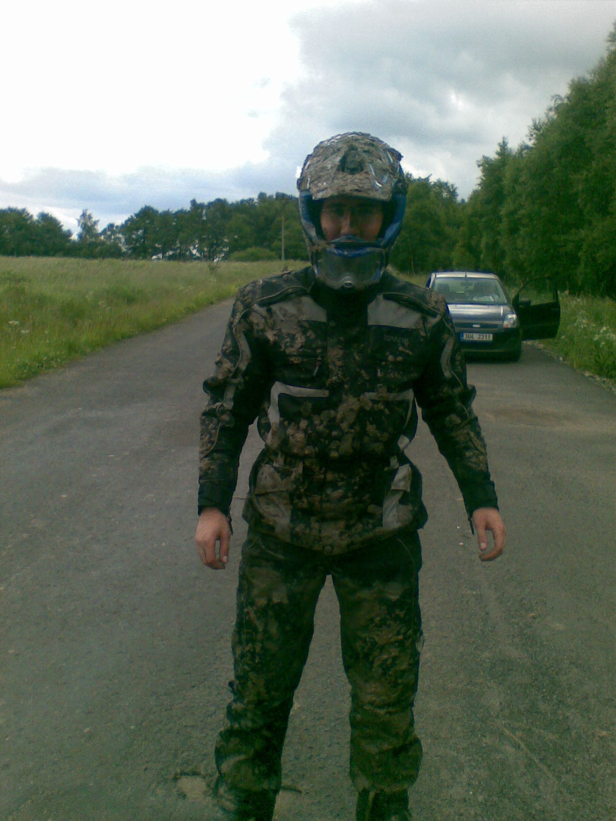 Kolega předemnou zajel do hluboký louže a v zájmu záchrany motorky to pěkně oroštoval - já si stihnul akorát dát ruku před brýle