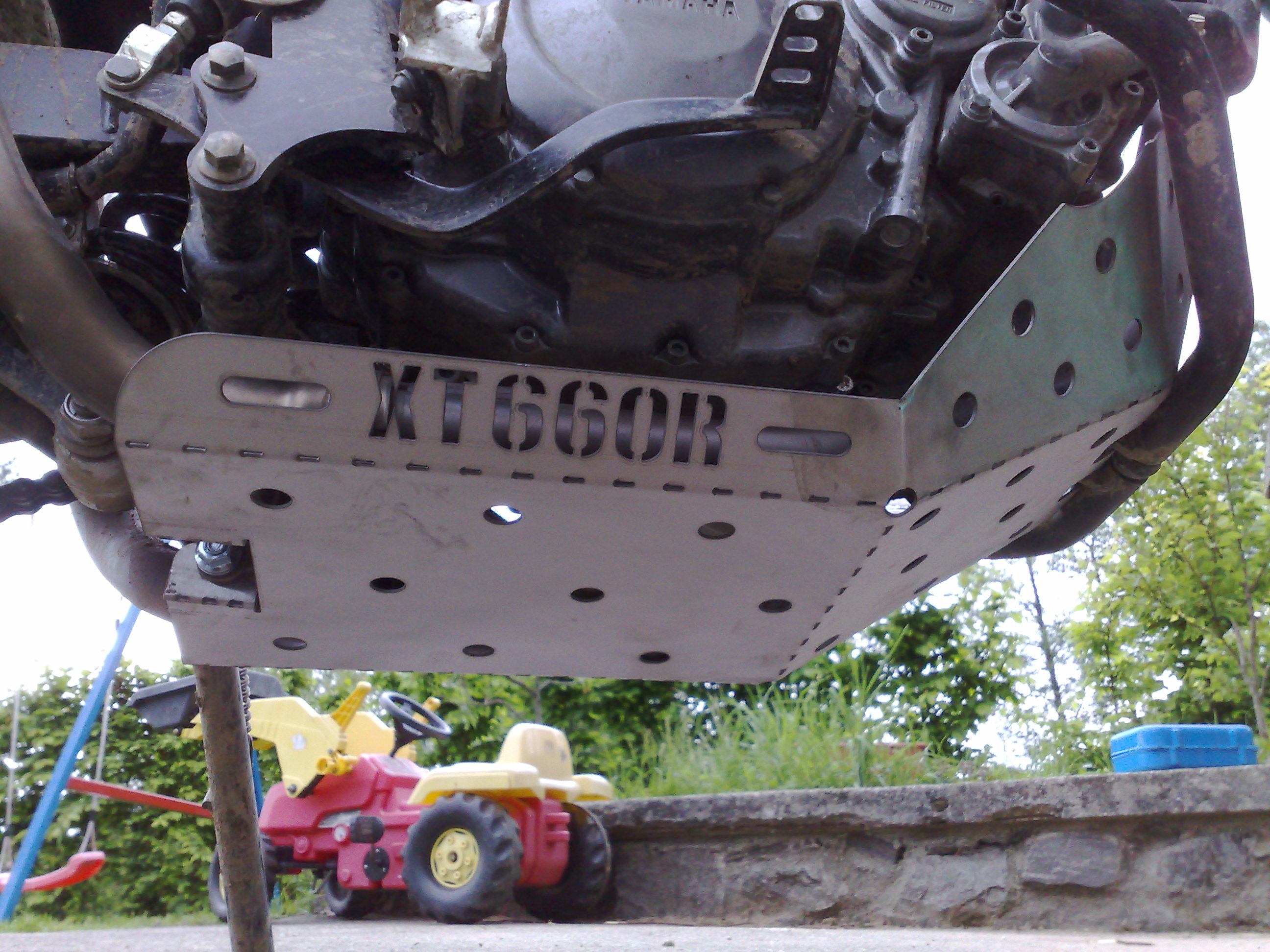 Přidávám fotky krytu motoru namontovaný na moto. Materiál nerez tl.1,5mm.
