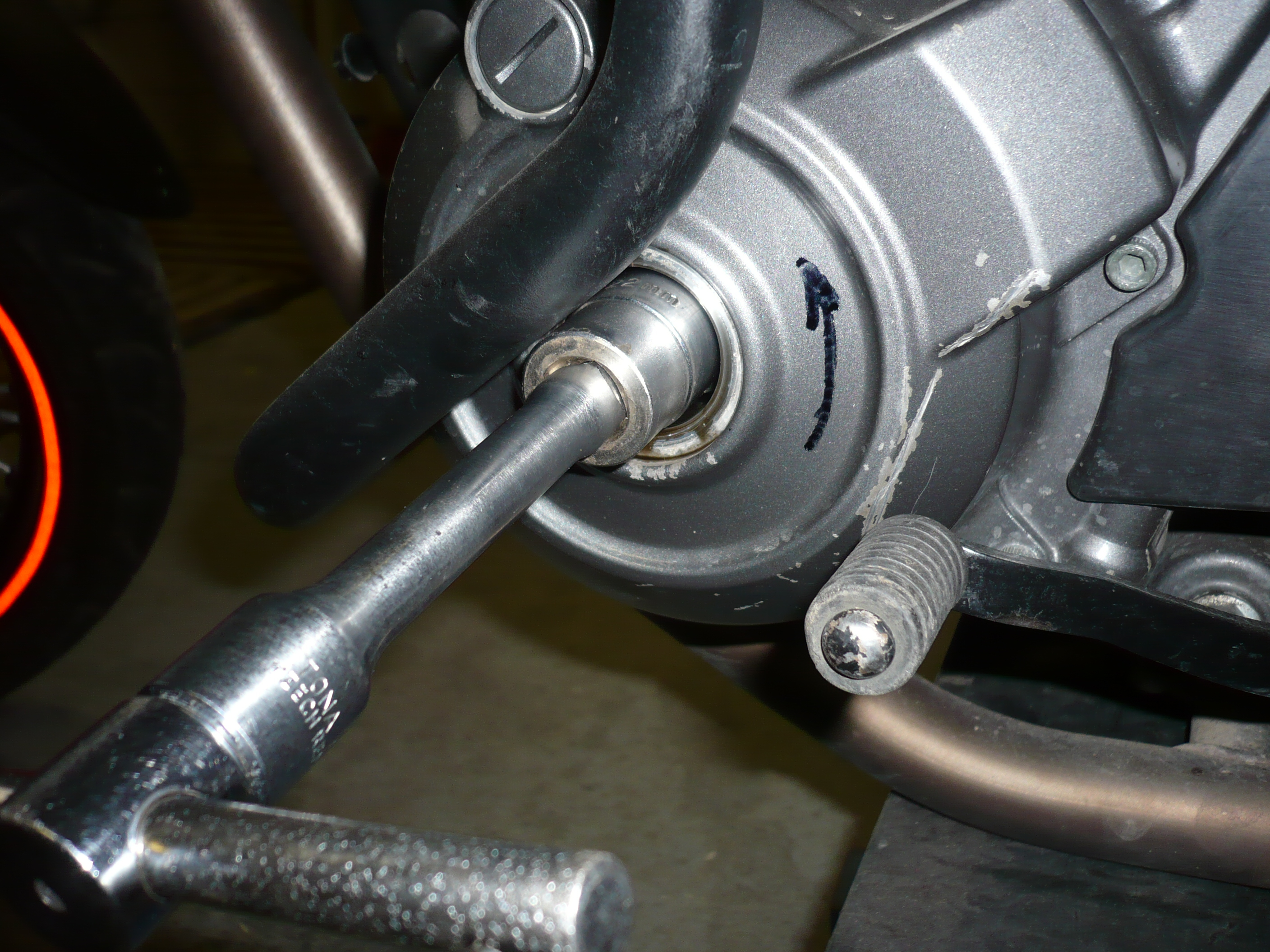 Krytka je plastová,tudíž nebude nějak silně dotažena.Nasadit ořech s téčkem na matici,směr otáčení motoru je označen šipkou