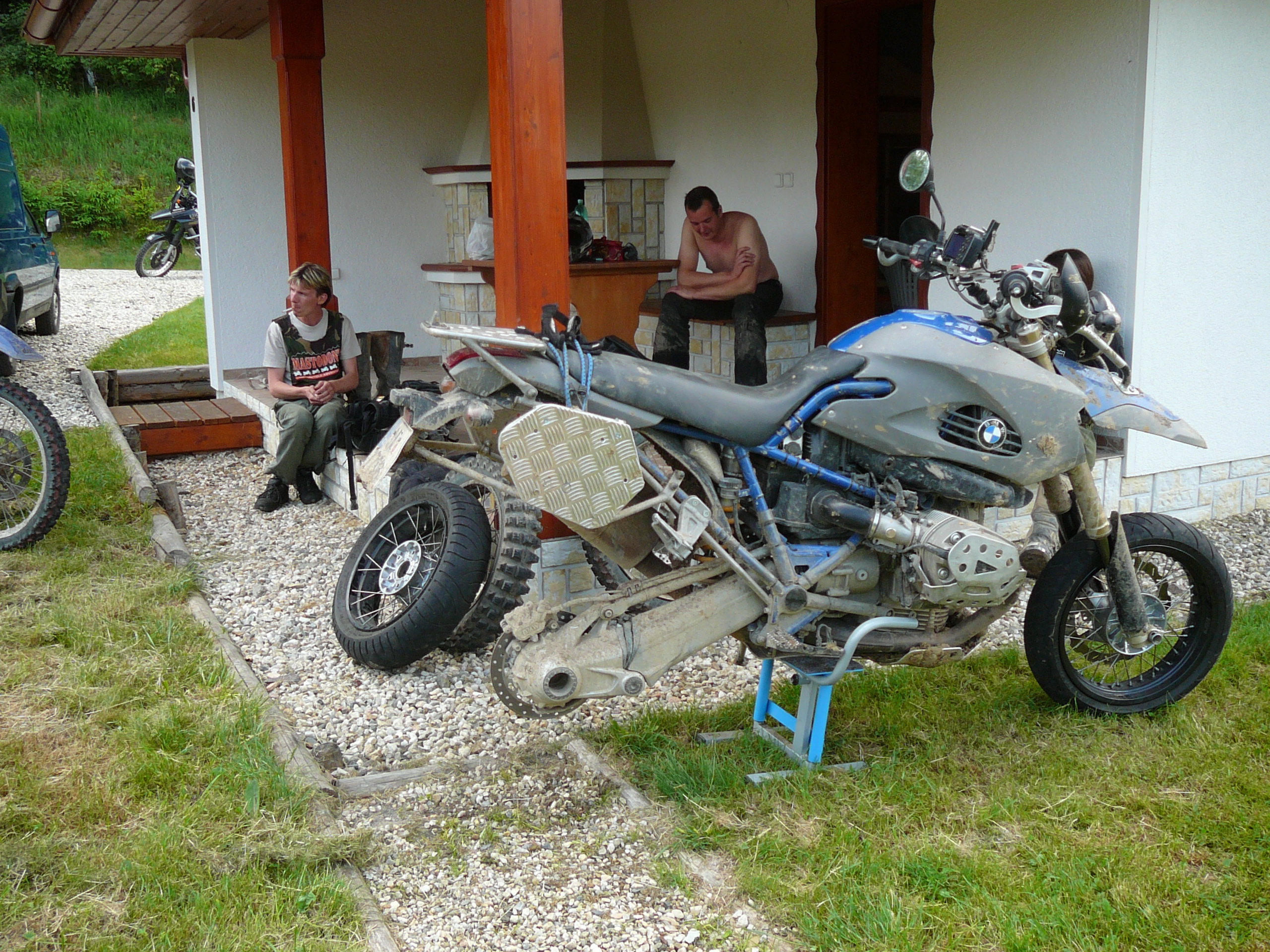. Stačí sundat enduro kola a dát místo nich motárdy a na to všechno si vystačím s jednou ráčnou a čtyrma ořechama. Samotná výměna kol je pak otázkou několika minut, naposled jsem měl za 15minut "přezuto" a myslím že časem to v klídku stáhnu ještě o 5 minut dolů..