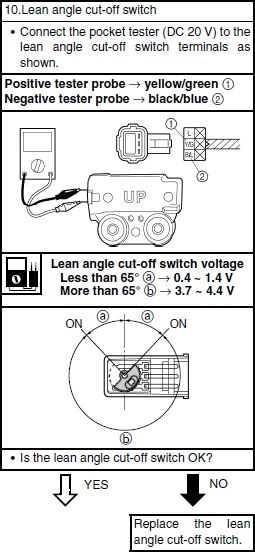 S tímhle čidlem jsou spojené dvě chybové hlášky, první číslo 30 říká, že bylo detekováno spadnutí motorky (náklon větší než 65° a je potřeba otočit klíčkem do polohy OFF a poté už jde opět nastartovat) a druhá chyba 41 znamená, že obvod pro toto čidlo je buďto rozpojen, nebo zkratován.