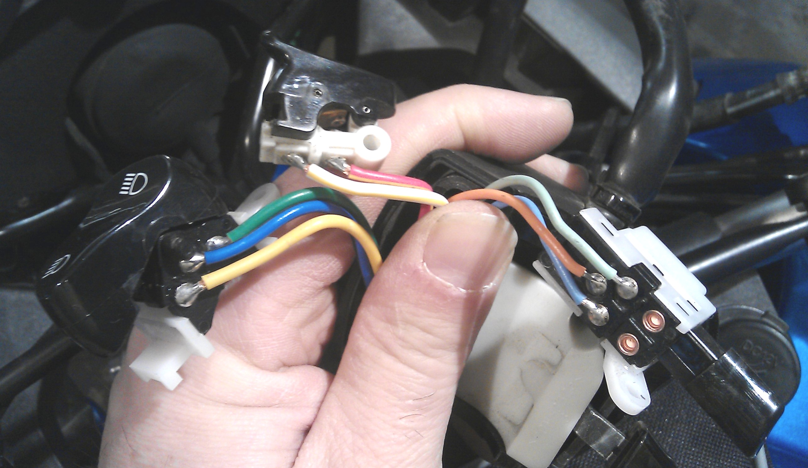 Abych tedy dosáhl kýženého efektu, bylo v mém případě (XT660Z, DM02/E, r.v.2010) nezbytné propojit kontakty přepínače světel (v pohledu na fotografii): střední s modrým vodičem (na který je přiváděno napětí) s pravým se zeleným vodičem (přívod pro "potkávací" H7). Tak je dosaženo toho, že žárovka potkávaček je napájena neustále a tedy svítí furt bez ohledu na polohu přepínače.