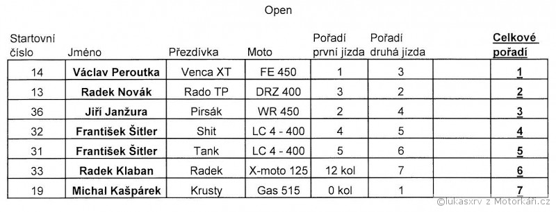a jen pro poradek: vysledky potvrdili moji domnenku ze me spatne napocitali ve druhy jizde (asi si nas s patrikem nejak spletli) pac mi hlasili konec kdyz mi podle najetejch km zbyvalo jeste jedno kolo. to jsem si sice odjel ale rozhodne jsem tu druhou jizdu neskoncil pred patrikem. diky jeho padu jsem sice od nej nedostal jedno kolo ale skoro jo. takze 2. jizda - Patrik 10. K.O.zel 11.