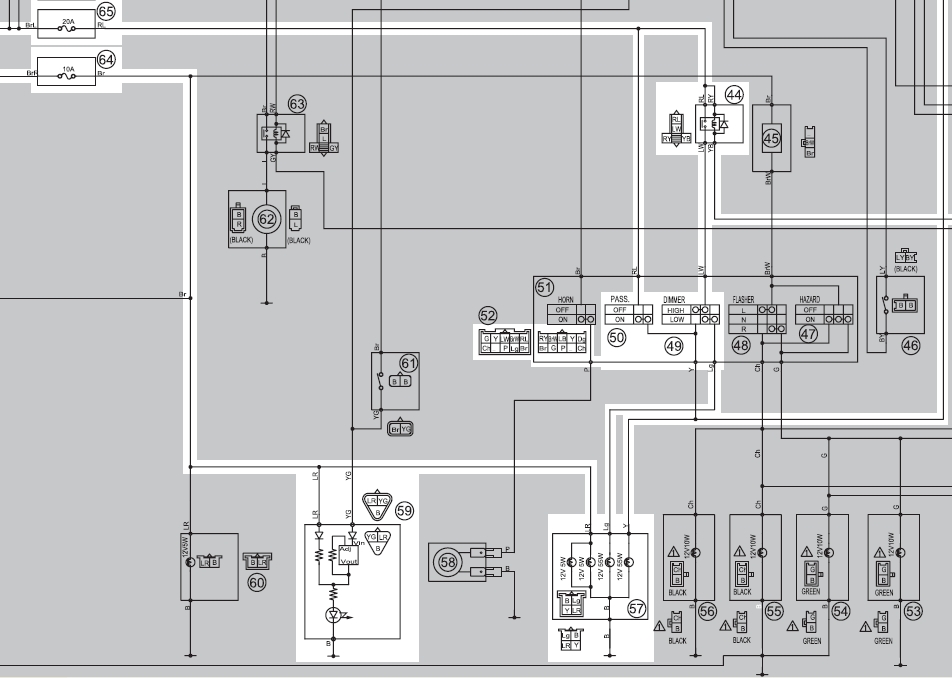 Je však nezbytný malý zásah, například překlenutí kontaktů přepínače hlavních světel v hlavním levém ovladači světel na řídítkách (tento způsob mě přijde nejjednodušší). Na výřezu ze schematu je vidět, že napětí (alternátor i AKU je propojen) pro napájení hlavního světlometu prochází přes pojistku (65) na vstup spínacího relé (44, sepne až po napětí z alternátoru, rozepne po vypnutí klíčku) a odtud je přiváděno na přepínač hlavních světel (49, HIGH/LOW) v hlavním ovladači světel (52, na levé straně řidítek). Z přepínače se napětí dostane na žárovku H7 v "potkávací, tlumené" parabole sdružených světel (57, levá žárovka 12V 55W) nebo na žárovku H7 v "dálkovém" reflektoru (57, pravá žárovka 12W 55W) a taky odbočkou k ŘJ pro aktivaci "modré" signalizace "dálkových". Na obrázku s rozebranými ovladači je vidět přepínač hlavních světel (vlevo, vodiče barvy žl.,mo.,ze.), tlačítko světelné houkačky (nahoře, žl/b. a če/ž. vodič) a spínač varovné signalizace (vpravo, svmo.,hn.,svze. vodič). Ostatní prvky (přepínač blinkrů a houkačka) jsou nerozebrány ve spodní části ovladače.