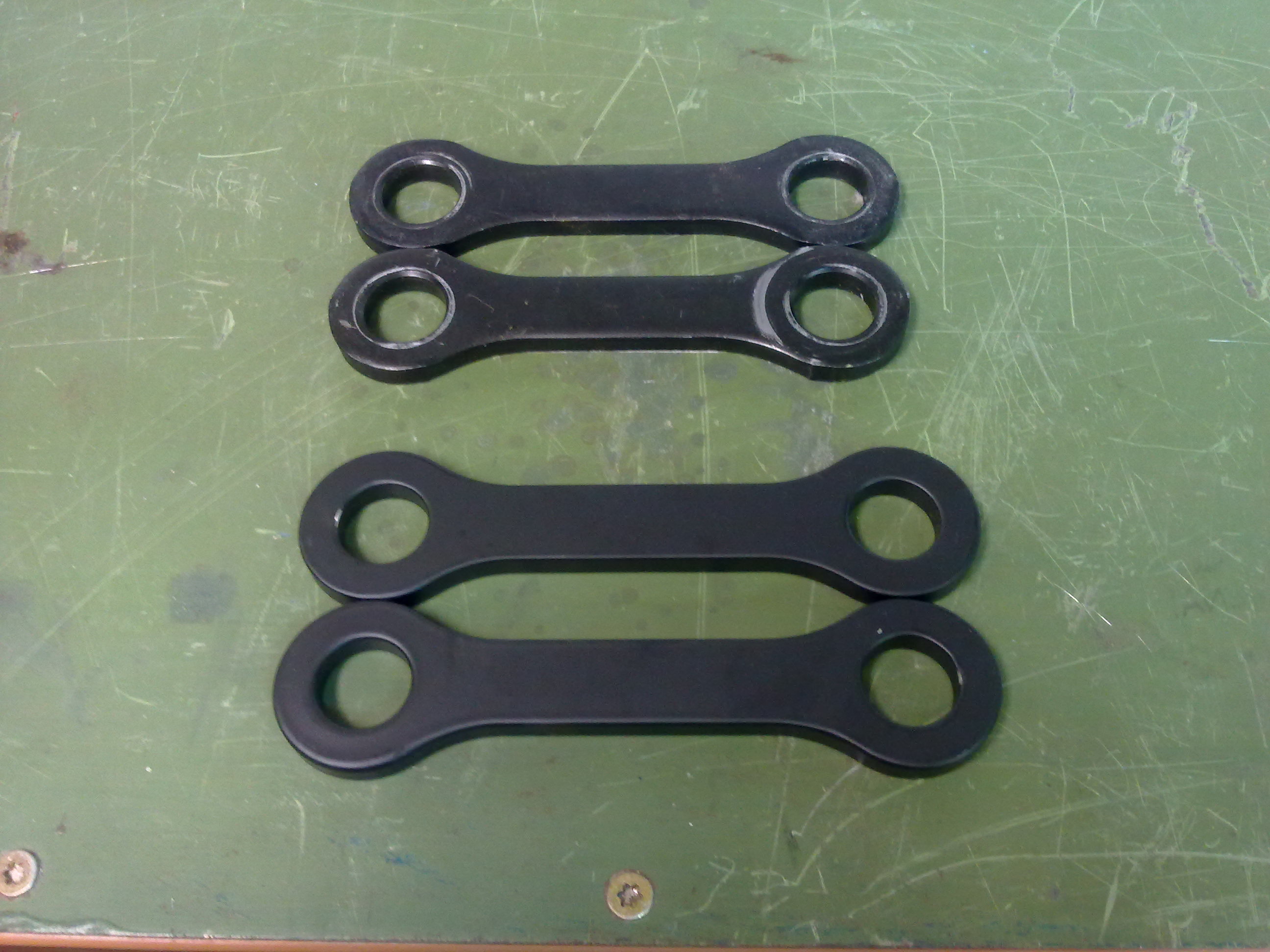 2) snizeni zadku: vymena "kosti" prepakovani za delsi. Zde potvrzuji postreh z tohoto fora, ze pomer prepakovani/kyvka je cca 1:4, tedy pri prodlouzeni "kosti" o 6 mm klesla motorka o cca 25mm mereno v ose zadniho kola. Kosti - material nerez, povrchovka komaxit, roztec der 91 mm.