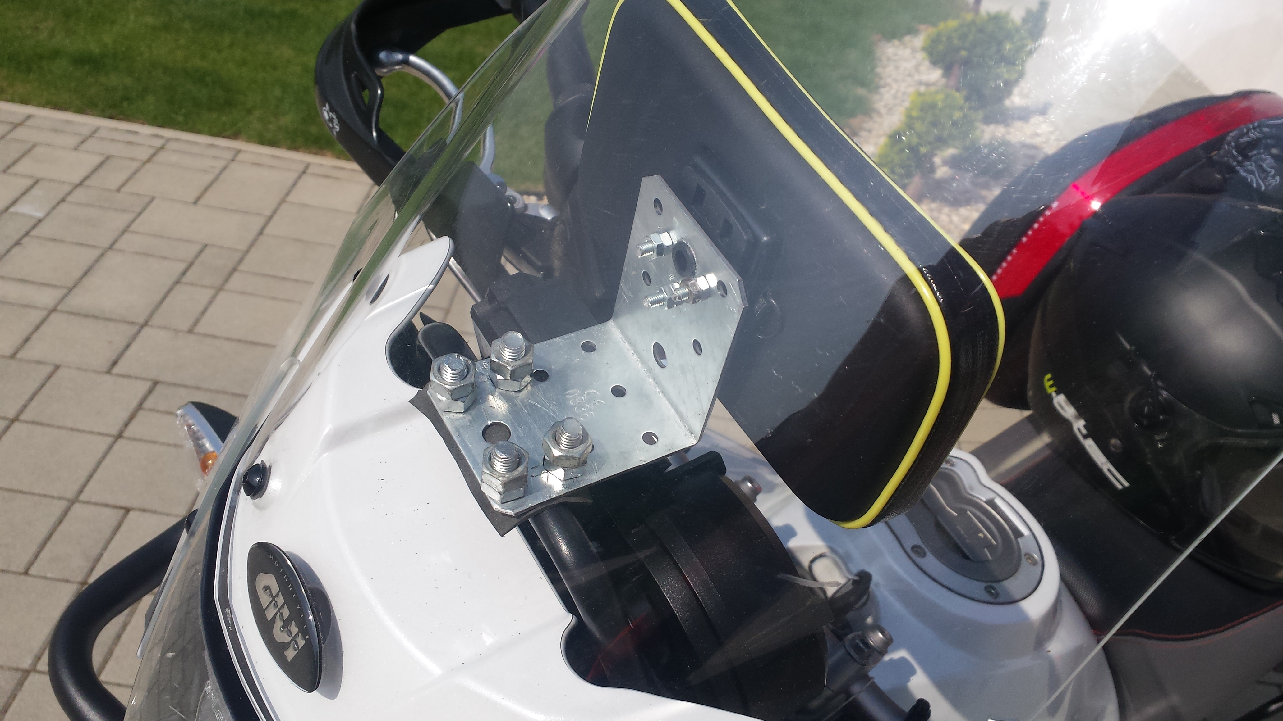 Takže jsem začal vymýšlet jak využít a zneužít tu hrazdu před plexi. Jak jsem psal výše, mám navigaci Garmin Nuvi 200 (na aukru jsem jí koupil za 700,- Kč), jako její velkou výhodu vidím malé rozměry, protože za tím plexi nepůsobí jak pěst na oko. Dokoupil jsem jeden držák do auta navíc (150,- Kč) klasická přísavka na sklo s kloubem a plastovým držákem - opět velmi kompaktní rozměry. Tento jsem upravil tak jak je vidět níže na obrázku. Odříznul jsem tu přísavku a místo ní vsadil do držáku dvě plechové konzolky (zalepené a prošroubované) na hrazdu si pak připravil dvě plechové objímky s gumou po obvodu a k těm pak držák našrouboval (mezi každý spoj vložena guma z duše). kulový čep jsem pak v ideální poloze zalepil epoxidem, protože i přes nízkou hmotnost gps, v terénu neudržel svou polohu. Najeto loni asi 4tis km (ukrajina, jeden offroad vikend, běžné ježdění) a maximální spokojenost. Při určitých otáčkách se přenaší na gps slabé vibrace, ale není to nic hrozného a navigace je v pohodě čitelná. Běžný déšť jí taky vůbec neohrozí, protože je pěkně schovaná za plexi. A výhody jsou zde jasné, dobrá ovladatelnost i v rukavicích, skvělá čitelnost i za slunečného počasí). Za cenu 900,- Kč včetně navigace, držáku jsem s tímto řešením zatím nadmíru spokojen.