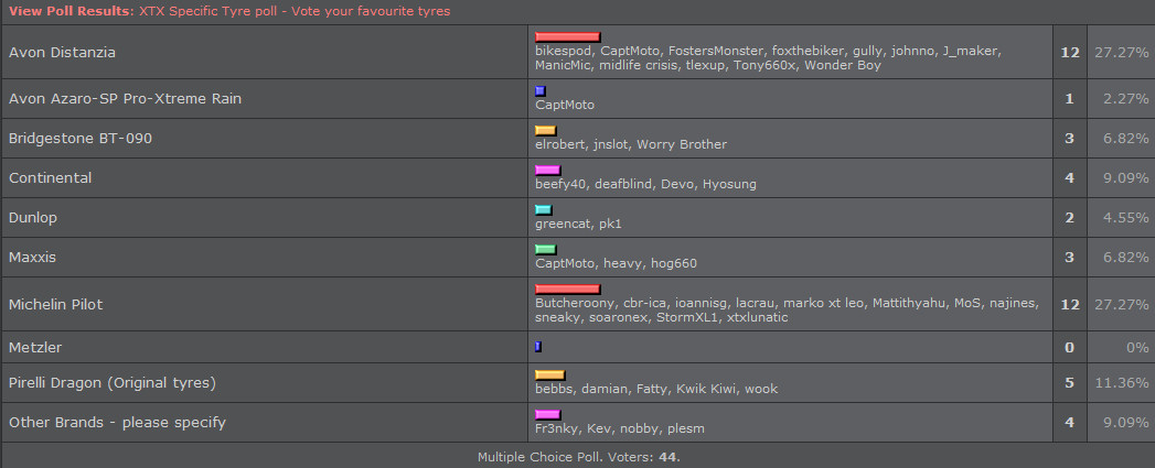 Shrnu-li to, tak ji tam vesměs chválí a většina, co ji koupila, by ji příště koupili zase. Přikládám sem ještě vyfocenou anketu oblíbenosti pneu (zdroj: xt660.com) Jinač u nás se dají sehnat za cca 5300 celkem (přední + zadní)