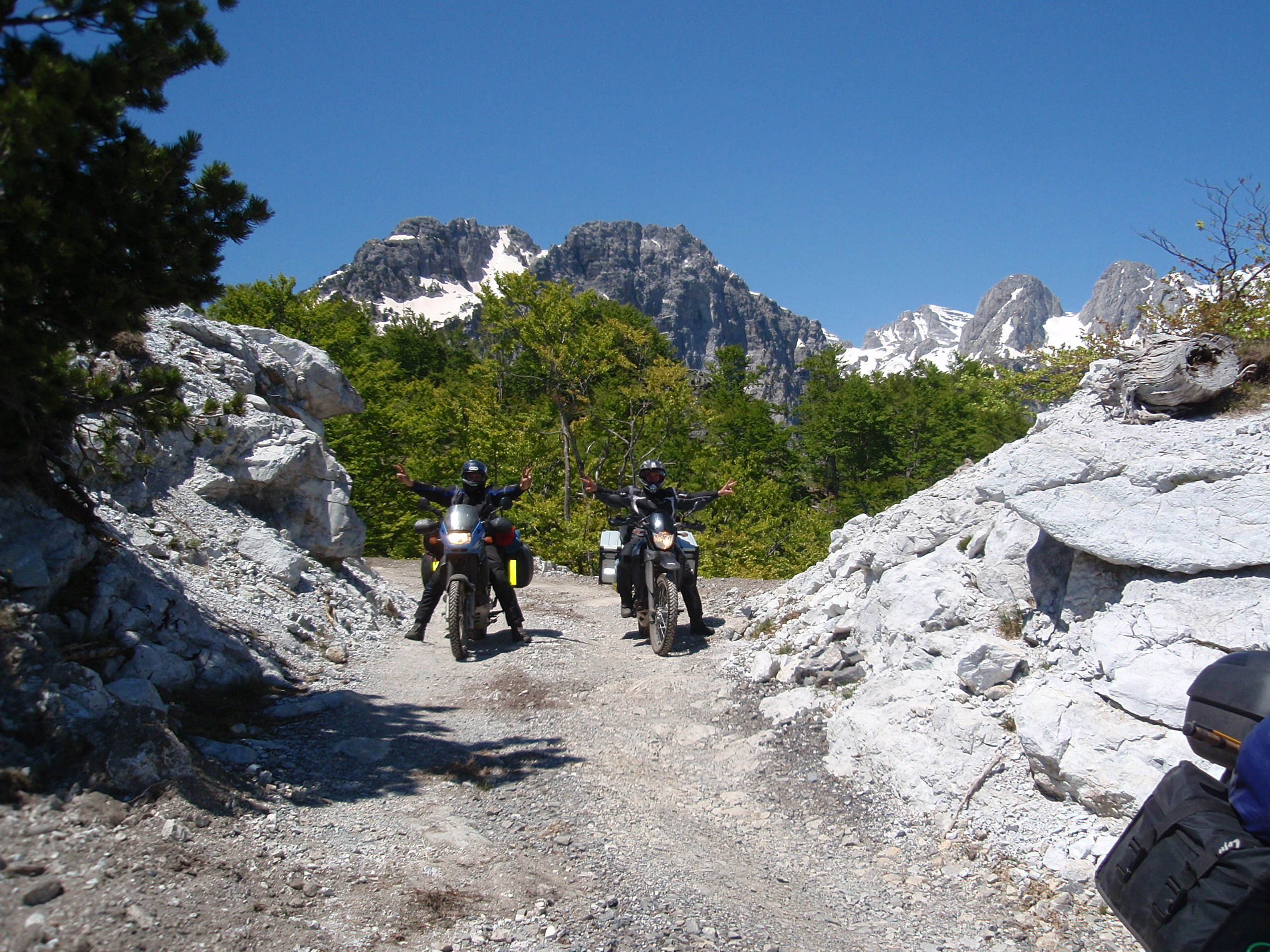 Vyrazili jsme z Brna na Bratislavu, propálili Maďarsko (jelikož to byla stršná nuda) a kousek za Bají překročili hranice do Srbska. Srbsko nás také moc neoslovilo, ale nutno dodat, že jsme tam nic nehledali, tak jsme ho projeli směr ČH. V ČH jsme přibrzdili u pohoří Durmitor a pokračovali směr Podgorica, kde jsme překročili hranice do Albanie. Zakotvili jsme hned u Skadarského jezera a ráno vyrazili do pohoří Theth. Výlet cca na celý den, takže jsme se večer vrátili ke zpět k jezeru a ráno pokrčovali dolů na pobřeží přes města Durrës, Vlorë, až do Sarandë. Jelikož jsme chtěli objet AL celou a s cestama to dál nebylo růžové, zvolili jsme přejzd do Řecka, a po nějakých 60 km zase zpět do AL, poté jsme v příhraničí pokračovali na Korcë, Podgradec a u Ohridského jezera do Makedonie, na Strugu, Debar a zase zpět do AL. Na cestě z Peshkopi do Kukëse nás dojeli dva bouráci z liberce na KTM 990 a BMV 1150, s kterýma jsme navázali družbu a dali si scuka ve Fierzë. Kluci z Liberce jeli údolí řeky Valbone(později nám smskou vzkázali že to tam taky stálo za to) a mi se za 10 eček nalodili na trajekt po přehradě do Komanu, potom na Shkedër, hned přechod do ČH, město Ulcinj a pohoda na pláži. Další den jsme sjeli Boku Kotorskou a pomalu přes Bosnu a Hercegovinu návrat domů.