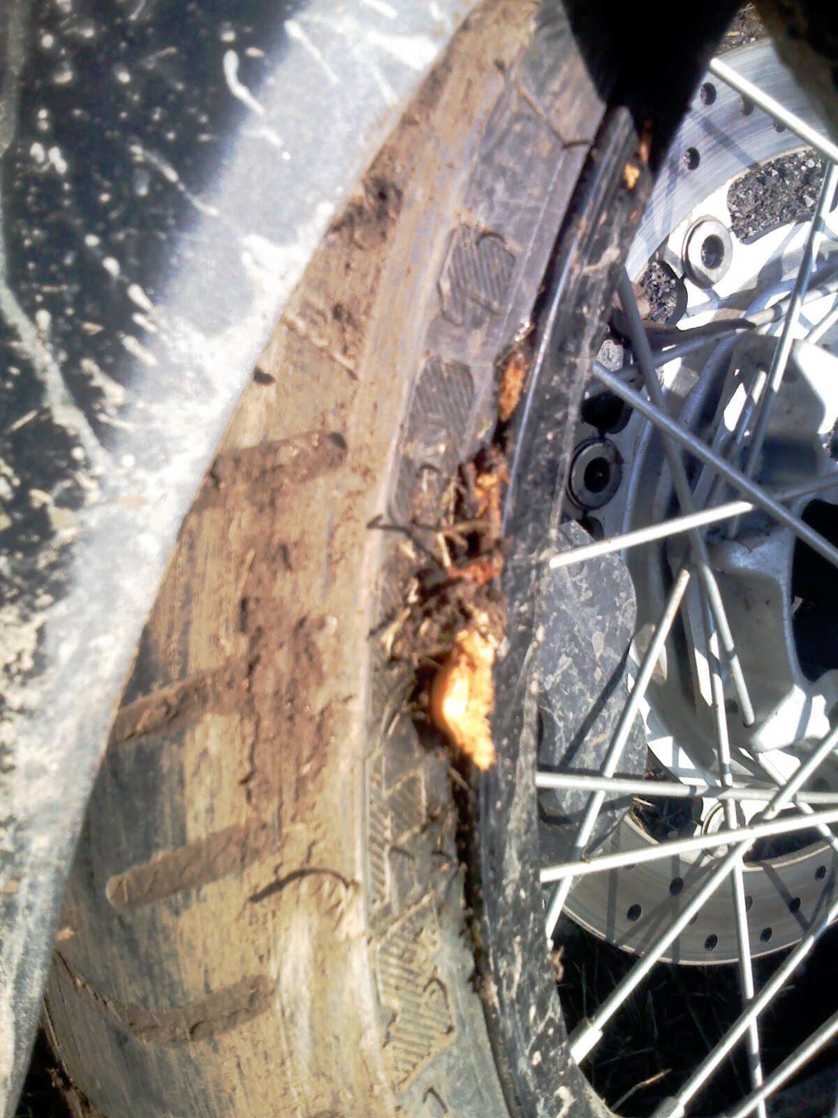 zaražený kus pařezu mezi ráfkem a gumou