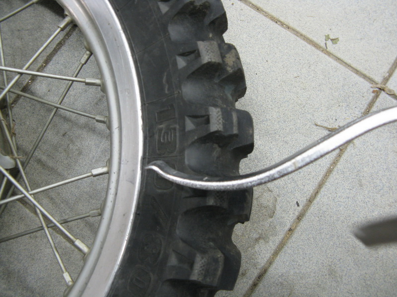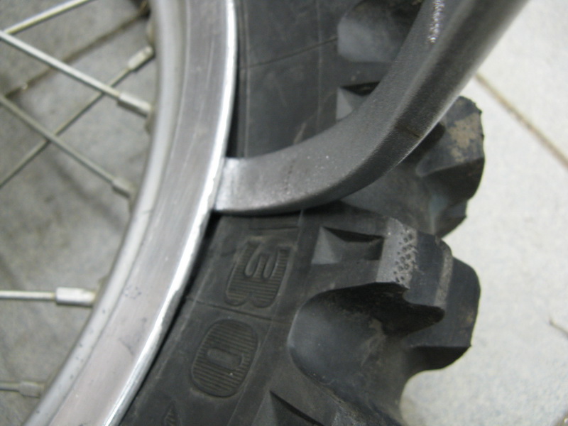 V prípade, ak nemáte po ruke monterpáku, môžete v kľude použiť na odlepenie pneu od ráfku bočák (bočný stojan). Ja som to tak riešil funguje to spoľahlivo. Z jednej moto sme zhodili koleso a druhou sme pomocou stojanu vyzuli pneu...