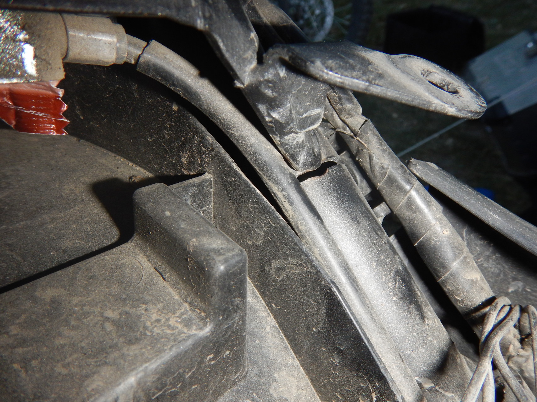 Nechal jsem stočit trubku dlouhou 300mm, tak aby šla zasunout do trubky rámu. Nechal jsem vytočit mezikusy odříznuté trubky dle měření na spasovaném stavu. Vyrobil jsem nový úchyt pro boční plast a madlo spolujezdce. Svařil jsem všechny části. Nastříkal. Teď by měl rám být pevnější než originál díky trubce v trubce a jinak řešenému úchytu madla spolujezdce, který má teď funkci další výztuhy v nejslabším místě.