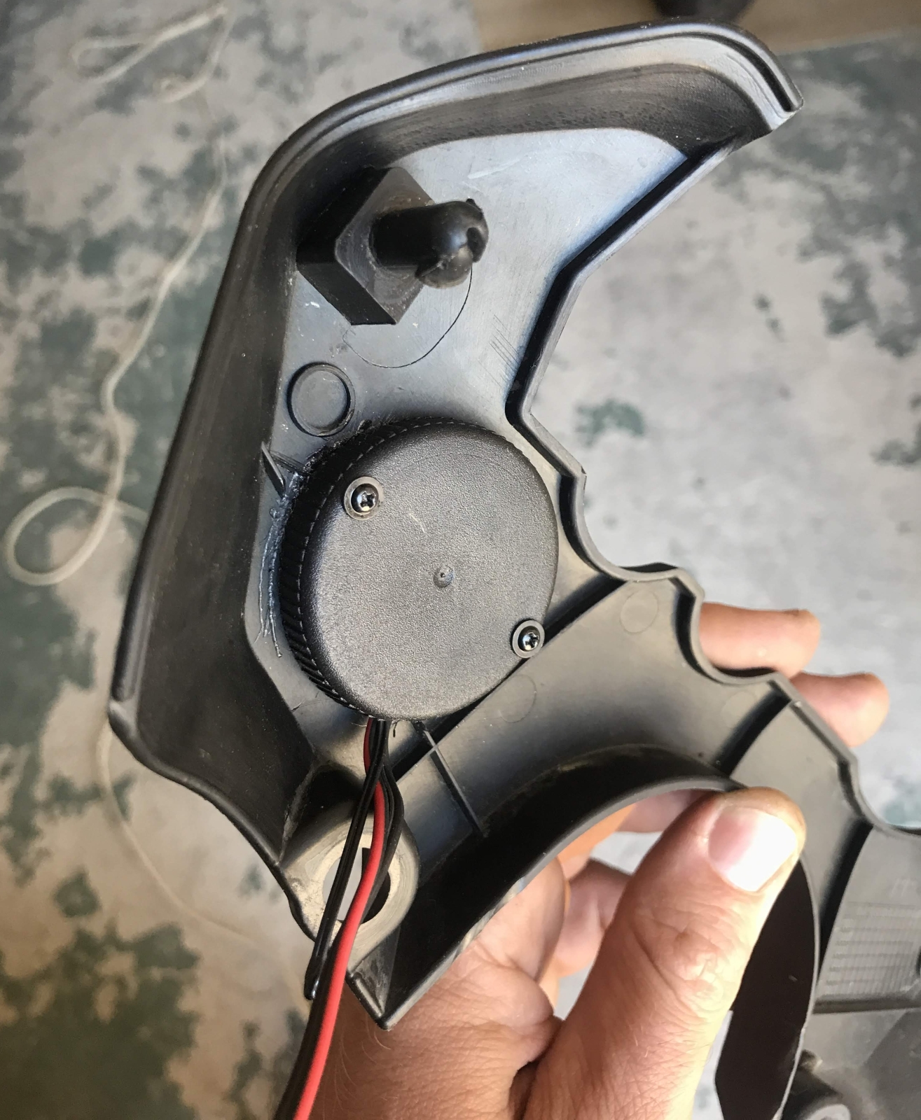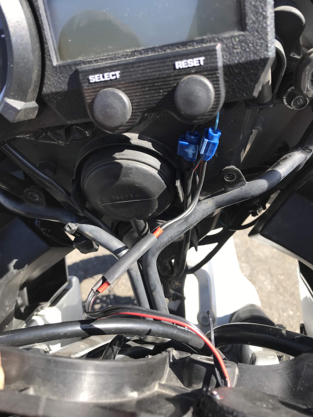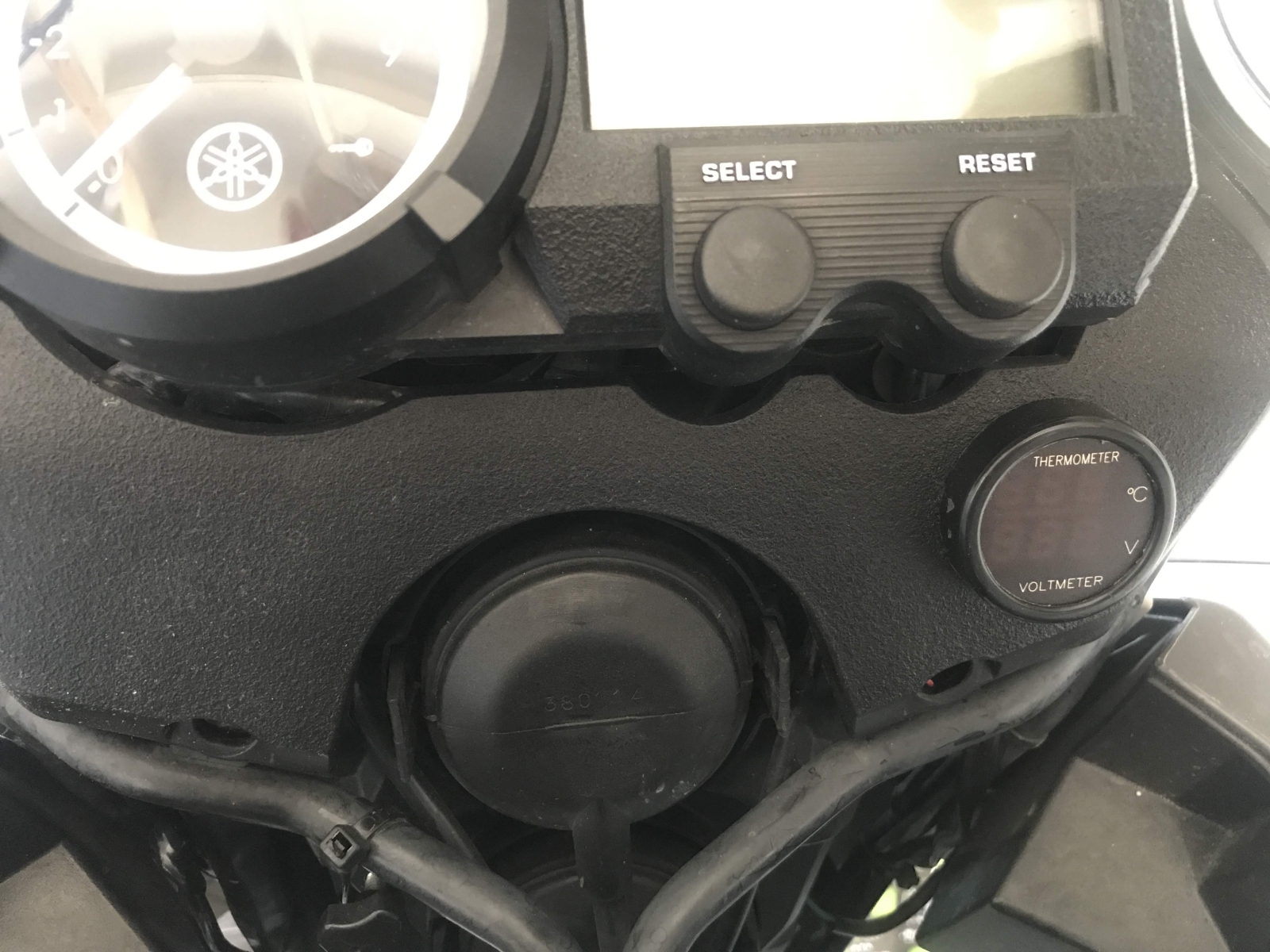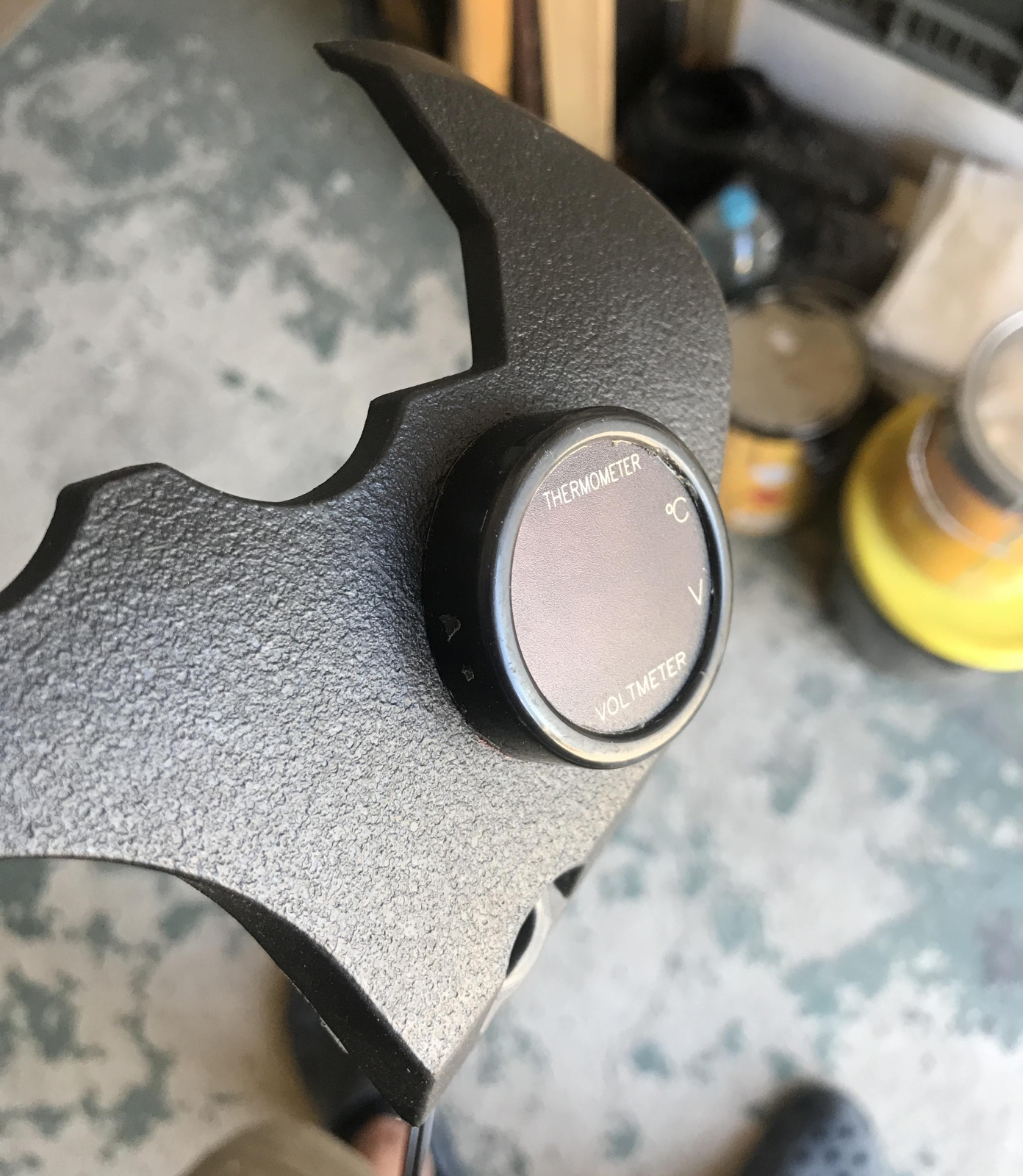 Rozebraný koupený měřák do autozásuvky. Použitý pouze vrchní díl se sklíčkem a vnitřní elektronika. zezadu jsem tišťák překryl seříznutým víčkem flašky od oleje a pro jistotu to ještě celé zapatlal silikonovým lepidlem na akvária. Napětí je přivedeno přes kabelové spojky z jedné z obrysových svítilen. Displej je trošičku zapuštěn pod sklíčkem oproti originálu a s ohledem na úhel uchycení je z pohledu řidiče velmi dobře čitelné pouze napětí, ale i ta teplota se celkem dá. Sluníčko na to nemá až takový vliv.