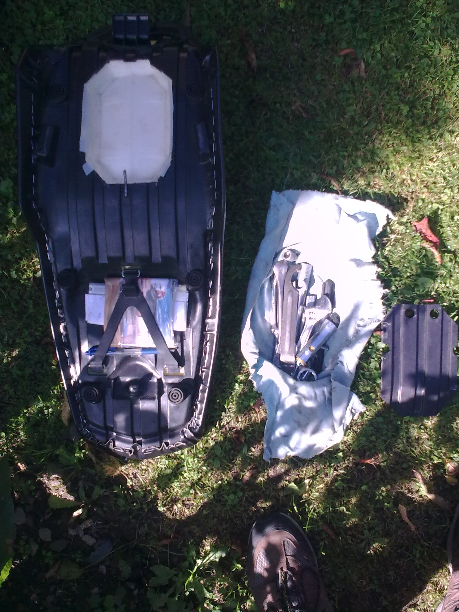 Po delší cestě se mi to sedlo pod mou zadnicí trošku žvejkne. Jinak to vypadá perfektně. Taky se mi zdá ten původní prostor na nářadí poddimenzovaný. V Yamaze si asi věří, že víc netřeba, ale když jsem doplnil pár nástrčáků a ořech na povolení zadního kola, tak už jsem měl co dělat, abych to tam nacpal a montpáky s lepením musím mít stejně mimo.