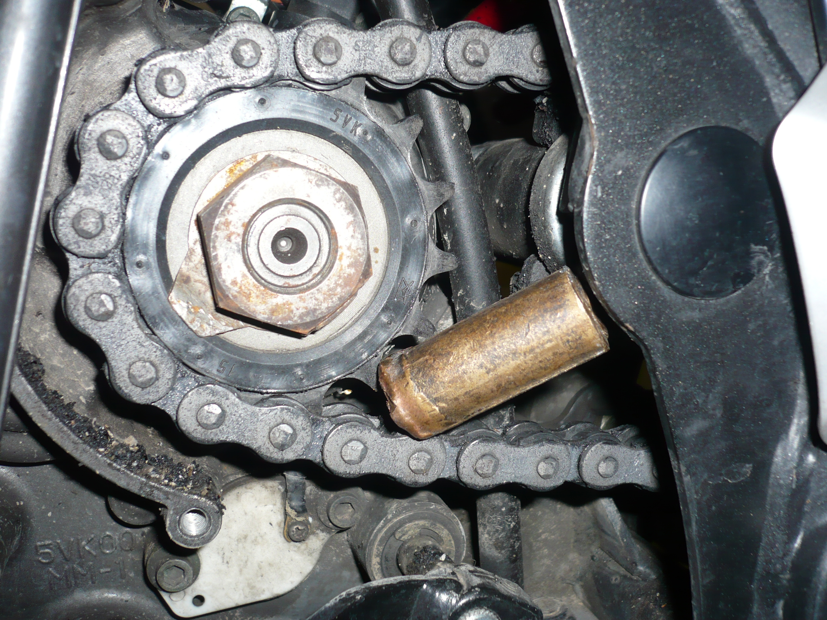 LiTe ,> sms od tebe jsem nedostal,pro povolení matky mám takový kousek měďi který zapřu mezi kolečko a čep kyvky ,je to dostatečně tuhé,když dáš mezo kolečko a řetěz klacek je to takové pružné a měl bych strach že poškodím žetěz,pže tam je třeba opravdu velkou sílu když to nebylo ještě od novoty sundáno. Já si myslel že taky něco povolí,šlo to těžce jak sviň.Je to pravý závit,takže pro tebe : když nasadíš ořech,tyčku dej na levou stranu,pravou rukou chyť ořech a levou tlač dolů.Jo a víš jak to je -když něco nejde silou jde to ještě větší silou.