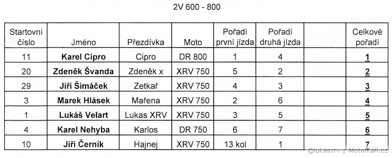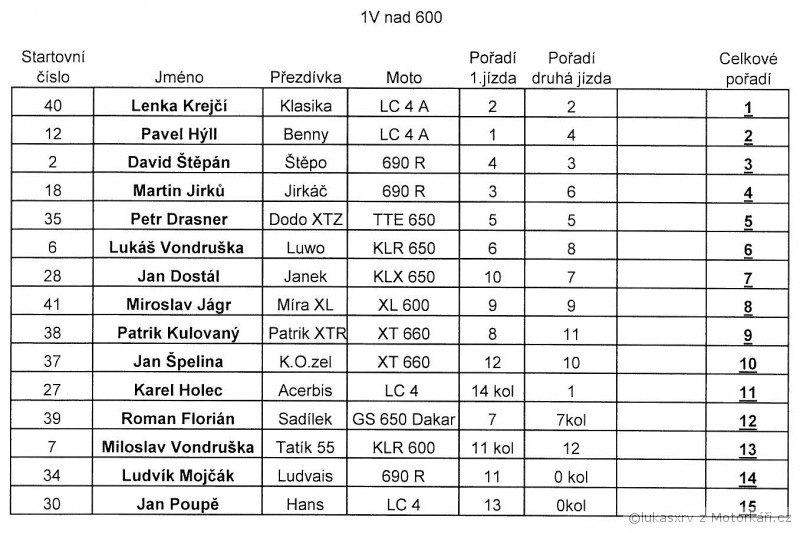a jen pro poradek: vysledky potvrdili moji domnenku ze me spatne napocitali ve druhy jizde (asi si nas s patrikem nejak spletli) pac mi hlasili konec kdyz mi podle najetejch km zbyvalo jeste jedno kolo. to jsem si sice odjel ale rozhodne jsem tu druhou jizdu neskoncil pred patrikem. diky jeho padu jsem sice od nej nedostal jedno kolo ale skoro jo. takze 2. jizda - Patrik 10. K.O.zel 11.
