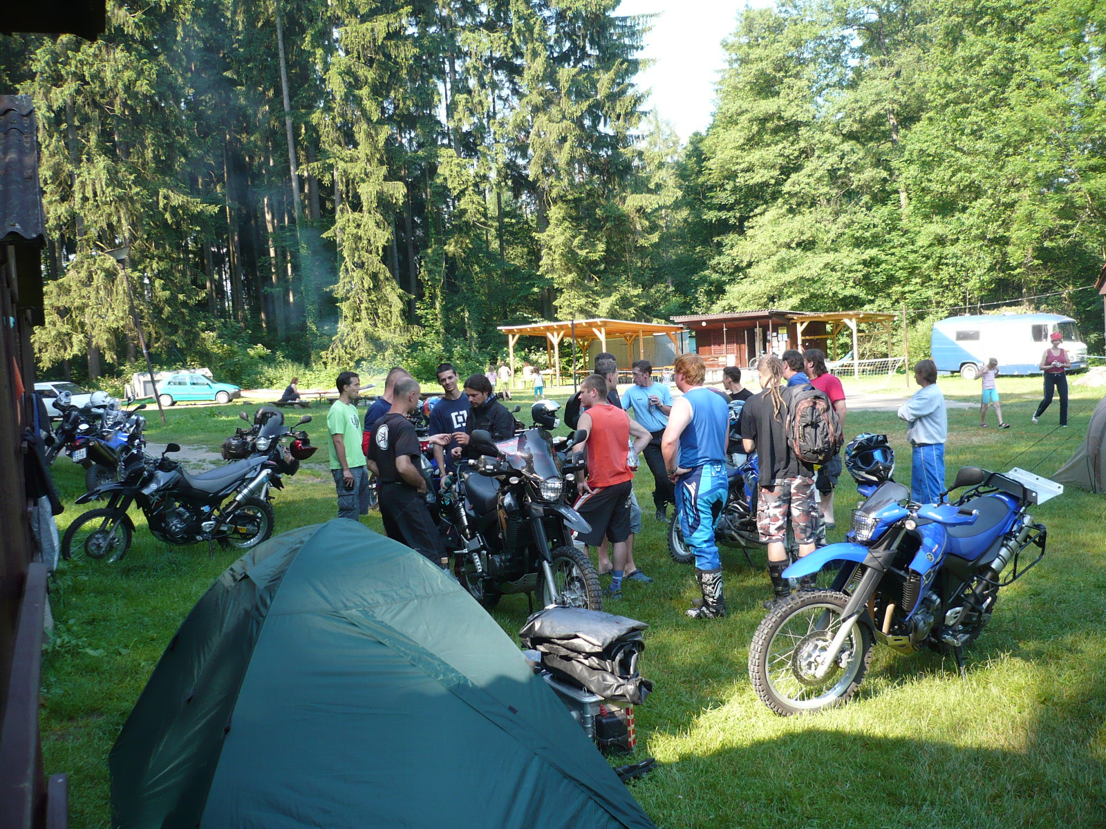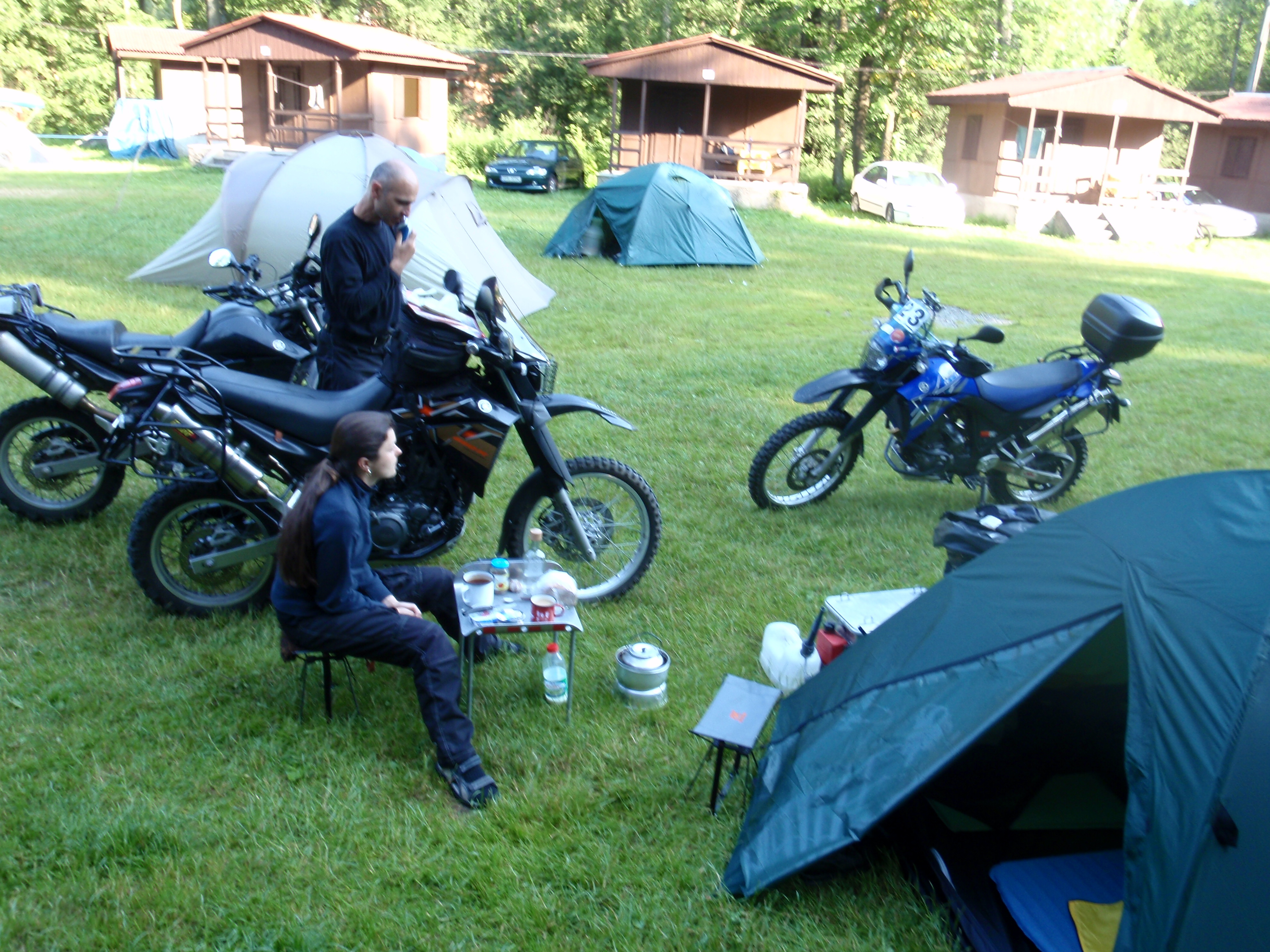 V pátek večer bylo u ohně kolem 35 lidí a o něco méně motorek. Naivně jsem myslel, že v sobotu nás bude ještě víc… Příští den ráno, až začli všichni vylézat z brlohů, se pomalu blížila sobotní projížďka. Rozdělili jsme se do dvou skupin (enduro a silnice). Skupinku silničářů vedl Míla na FZ6, skupinku enduráků místní Jari.