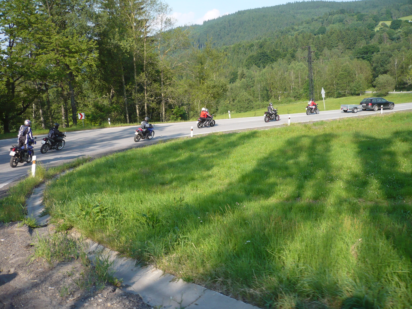 . Vše bylo v pohodě až do doby, než se Liťák rozhodl předjet kamión. Ne moc přehledná zatáčka, malý horizont, úzká silnice a auto v protisměru. Kamiónu se zastavila kola, protijedoucímu autu jen jedno, takže šel ještě trochu bokem a mezitím to tak tak stihnul Liťák profrčet. Spálené gumy ještě dlouho cítili všichni ostatní, co tím místem projížděli. Po loňském srazu jsme čekali, zda nás letos Liták překvapí nějakým novým trikem. Tohle ale nemuselo dopadnout vůbec dobře – naštěstí se tomu teď můžeme jen zasmát. Zbývající cesta do kempu probíhala v podobném tempu. Novým E09 jsem ještě stále moc nevěřil (přecijen je to oproti motárdům rozdíl) a místama jsem klukům ztrácel.