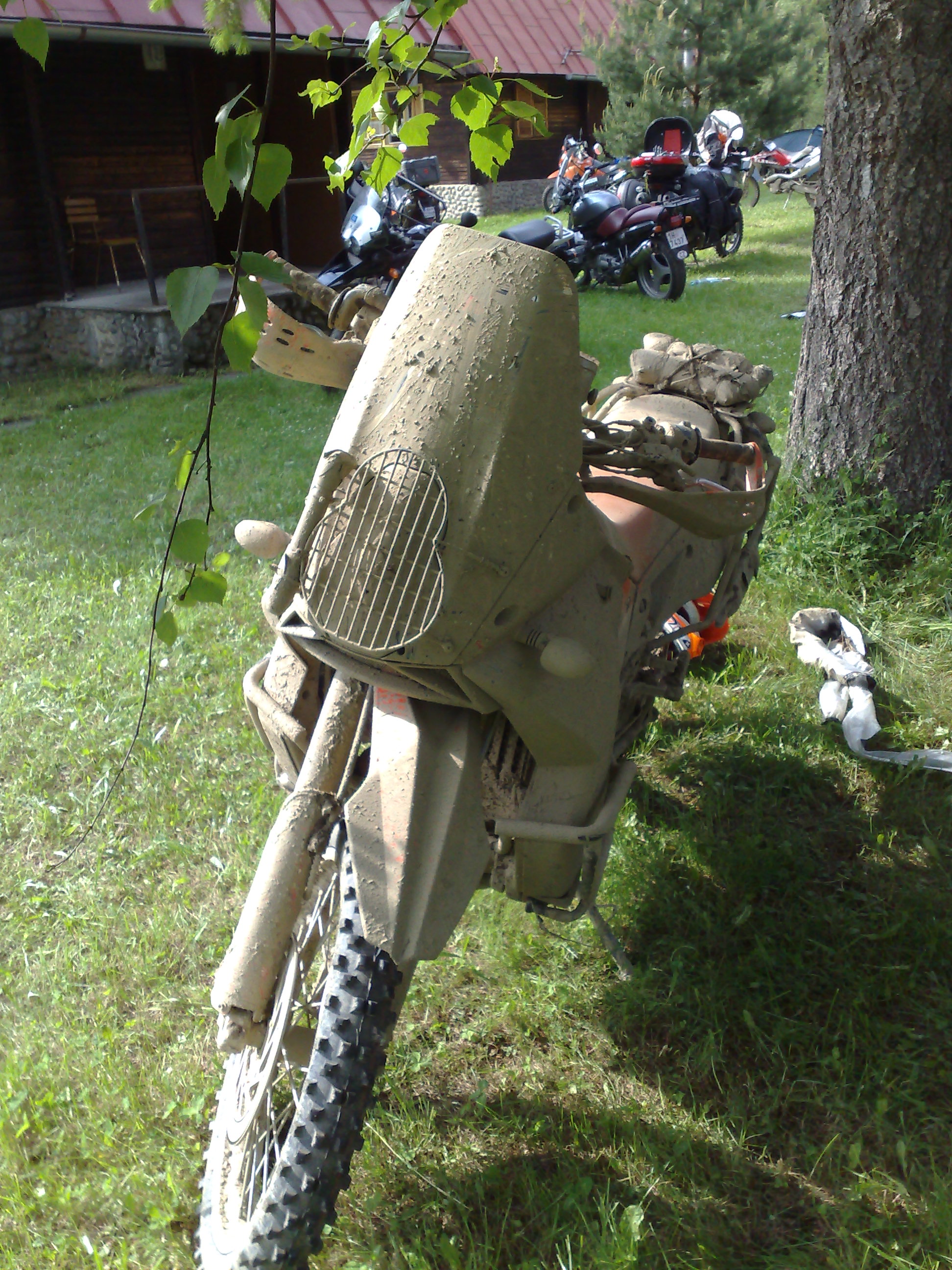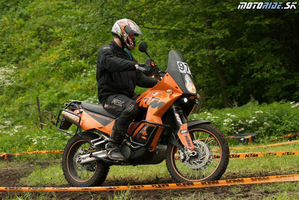 Máme čísla kolem 30, takže chvíli po 9 už se řadíme na start. Místo studování trialové tratě, oblížím svůj prověšený řetěz a už jdu na start. Lup a támhle je ten hup, o kterém mluvil Awia a už odšlapuji po asi 20 sekundách jízdy mi naskakují 4 min penalizace. Kur… říkám si, než stačím dokroutit hlavou jsem už u slalomu, první, druhá, brzda do pi…, zapomněl jsem vypnout ABS a šlapu znova a navíc jde motka k zemi. Pneu přejíždím bez problémů a kroutím hlavou ještě víc než poprvé. Jako kdyby nás na to Awia neupozorňoval. Po 2 minutách jízdy, jsem už vlastě 10 min na cestě. Nic se nedá dělat, trochu za to vezmu, následuje přejezd, kde jakž takž dodržuju rychlost, hlavně v obcích. Po chvíli vidím Ýbrce (setkání č. 1), po sjezdu na lesní šotolinku ho předjíždím a otvírám plyn. Tady už se nekrotím a jedu, jak umím. Předjíždím další jezdce Romana na Hajného Africe, Doktora s Jirkáčem. Tady poprvé lehám, ale rychle jedu, rychle zvedám, Jirkáč mě dojíždí naskakuju a zase ujíždím. Ve sjezdu cca po 30 km předjíždím Matúše a Babčiho. Mávneme na sebe a letím dál. Po 40 km se stává neskutečné, dojíždím RadkaR6 a to je mi jasné, že tady se muselo něco stát. Radek stojí v brodu a nemůže jet, jdu ho tlačit, ale když už chytám za nosiče motka odskočí a Radek odjíždí. Jdu zpátky k motce přejíždím brod a přemýšlím, kde Radek chytil 20 minut sekyru. Radek nechytal sekyru, ale Radovana. A stalo se, že se jeden asfaltový poloměr zatáčky nesloučil s Radkovou rychlostí a opustil zatáčku po tečně. V těchto místech lehnul i Ikebara a závod pro něj bohužel skončil kvůli prasklé podsedlovce. Přemýšlím a přijíždím k mláce, kterou chci objet protože, nechci riskovat utopení, pořadal mi ukazuje, že se to dá jet, tak shodím motku zpět do stopy a mlákou bez problémů projedu. Další políčko v roadbooku je mi osudné. Špatně odbočuji a jedu, najíždím si asi 10 km. Vracím se k začátku výjezdu, který se podobá výjezdu naznačeném v roadbooku. Odečítám špatné kilomenty, ale i tak mi asi 600 m chybí. Nádherný kamenitý výjezd tvaru ostrého V s kameny a kládami. Vyjíždím nahoru a pokračuju dále. Pak zastavuji rovnám si kilometry s roadbookem a zjištˇuji, že jsem měl projet checkpoint. Ten jsem neprojel. Vracím se dolů a ve výjezdu potkávám Romana s odloženou Afrikou. Ptám se ho, jestli jede dobře. Odpověď zní, já určitě jooo. Myslím si svoje a jedu dolů. Pod výjezdem, potkávám Ýbrce a Jirkáče, hmmm ty už jsem dnes taky viděl. Ýbrc mi ukazuje pole v roadbooku a směr, kde je checkpoint. (prý i chaloupku samotnou, ta už je ale mimo můj dohled). Jedu dolů a opět dle mého názoru míjím cestu po dalších km potkávám Matúše, rezignuji a nechávám se vést. Předjíždí nás dva rychlejší jednoválce, tak se jich chytám a jedu s nimi. Na další křižovatce, stojíme oba čučí do roadbooku a kroutí u toho hlavama, ještě že nemají chlapci hlavu na závit, jinak by hlavy z krku upadly. Rozhodnu se čekat na jistého Matúše, ten za chvílí dojíždí a potupně jak školáček, kterého vede maminka do školy se nechám vést na checkpoint. Mezitím nás znovu předjedou závitoví hoši, ale nechávám je jet. Na checkpointu srovnávám roadbook mrknu děkovně na Matúše a letím nahoru. Ani ne po 1 km je tu mně už známý výjezd. Na rozdíl od prvního pokusu řadím 2 a ve výjezdu předjíždím oba již dobře známé. Následuje blátivá pasáž. Snažím se držet vysoké tempo, asi 3x jdu k zemi, ale rychle zvedám. Při asfaltovém přejezdu to jednou taky nedávám a letím ze zatáčky ven, cesta je více než metr na polem, minimalizuji rychlost, zatáčka je přehledná pole krásné. Prostě ideální podmínky. Před hranou srovnám motku, prdel dozadu (tak jak mě to učil předseda) a jdu ven z cesty. Motka se odlepila z vozovky a následuje let, jak mrknu přes plexi, tak si říkám, že takhle vysoko a hlavně rychle jsem s touhle motorkou snad ani nikdy nechtěl být, sevře se mi zadnice, motorka ale krásně dosedá na obě kola v poli brzdím otáčím se a musím kus po poli, abych našel nižší místo na vrácení. Pokračuju dál, neubírám, zase tolik se nestalo. Následuje lehčí off a pak zase zpět na asfalt. Lehká vlevo kolem budky a pak zase vlevo na asfaltovou cestu. Odbočku míjím a v dálce vidím křižovat cestu RadkaR6, jeho směr mě zmátne (má za sebou už několikakm smyčku) studuju jeho směr, roadbook, pak se několik km vracím, pak zase zpět, kde jsem potkal Radka, potkávám Ýbrce, po kolikáté už říkám si. Říká mi políčko, to vím, že zase nesedí, tak jezdím po asfaltce tam a zpět, naneště několik závodníků, kteří mě dojíždějí, bloudí úplně stejně, asi po 20-30 minutách to dávám do kupy s jedním z jedců na Aprilii. Letím nahoru a roadbook zase sedí, slastný to pocit. Následují šotolinky, o kterých mluvil Awia. No zase tak hrozné to není. Dá se pěkně letět. Po obou stranách je uzký příkop snad 1,5 hluboký. Dívám se do roadbooku a trochu zpytuju svědomí a dumám nad svou navigační tupostí. V jedné zatáčce si chci trochu přibrzdit, šáhnu na páčku a v milisekundě mi proběhnou hlavou Awiova slova o brždění na této šotolince, vlastně jen 2 slova: „Brzdit nelze“. Pi.ááááááááá, snažím se, co nejvíce zatočit, brzdím, motku sklápím jak Dryml, do příkopy v podstatě sjíždím už v přímém směru, zůstávám v sedle, zastavuji. Nic se nestalo, ale není mi jasné, jak se odsud dostanu. Otočím se a tutéž situaci, řeší jezdec za mnou na Aprilii. Padá, ale motorka zůstává na cestě, jen je trochu stočená do příkopy. Jdu mu pomoct, zastavuje ještě jeden jezdec a motorku rovnáme. Přemýšl