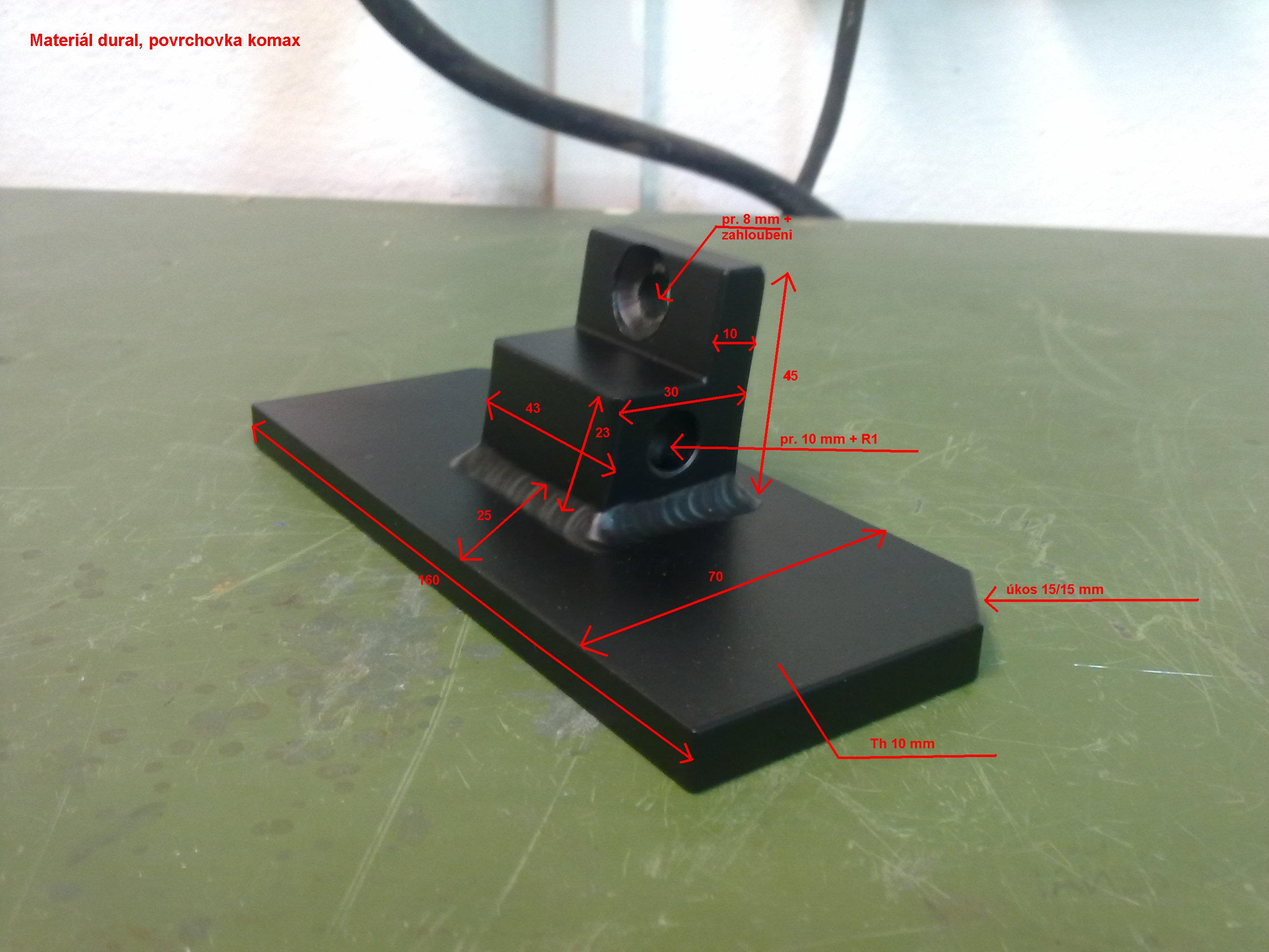 Material dural, povrchovka komaxit, vaha kusu 402g (ze zeleza je to 1,5 kg!to jsem zkousel pri vyvoji jako pokus nanecisto). Samozrejme kostka se vyrobi zvlast a plotna taky a pak se to svari k sobe, ALE POZOR! tady je trochu problem. Vlivem tepla pri svareni se plotna prohne (kraje jsou vys o 1 mm proti stredu) a na takhle prohle plotne se moto houpe, tedy po svareni je treba plotnu prefrezovat - zarovnat! Doporucuju dodrzet uhel 82°, ten zajisti to, ze po zvednuti ma moto predni kolo na zemi a zaroven plotnicka lezi celou plochou na naslapnem stojanu.