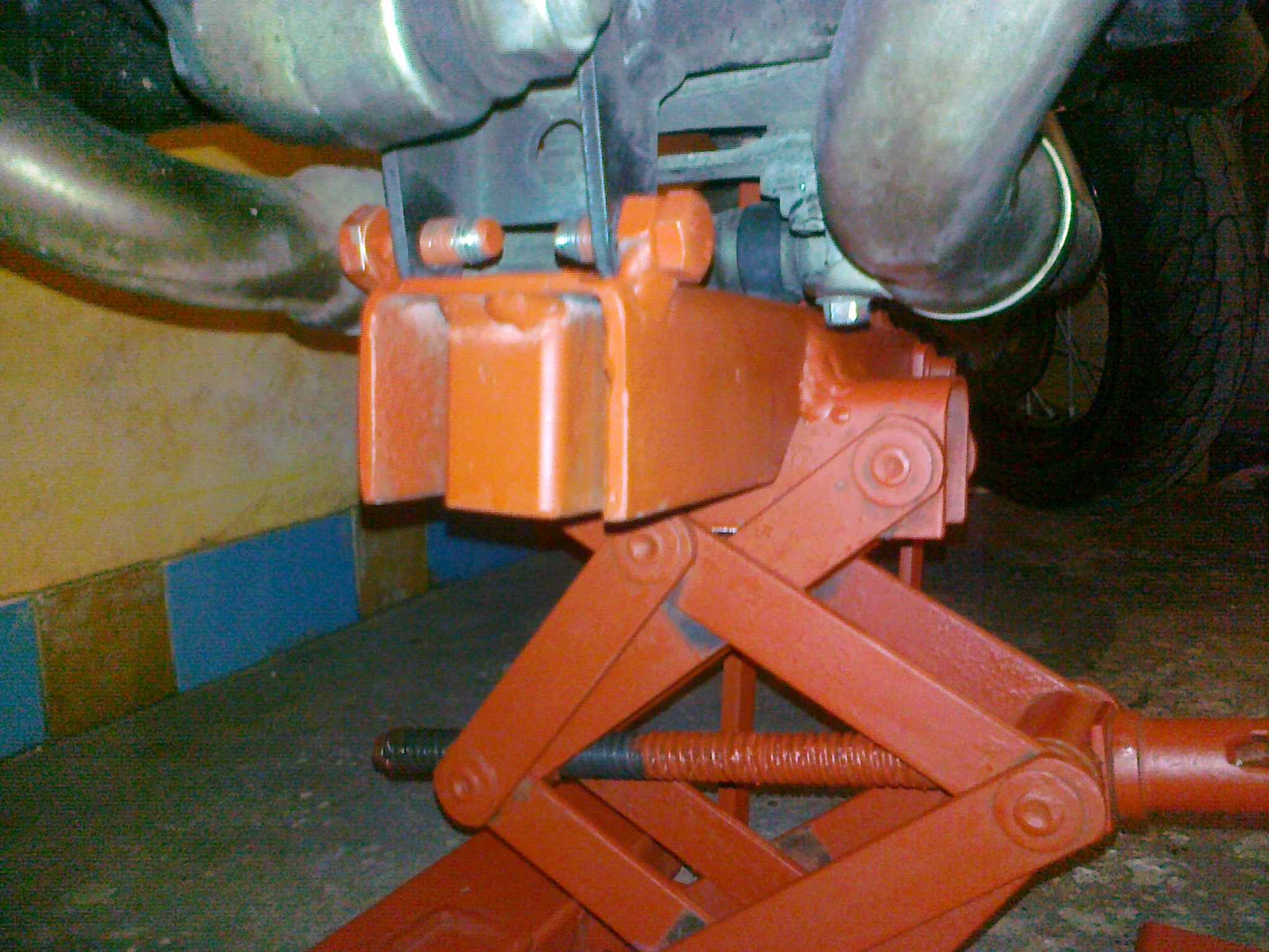 . Kámoš má doma ten stojan na enduro a ten je dost vysoký a pokládat mašinu na svody se mi fakt nechtělo... Udělal jsem podstavec, na který je navařený hever (trošku jsem ho zpevnil aby tolik nechodil do stran). Na hever je pak navařený U-profil, na jedné straně jsou matičky a šrouby kvůli upevnění k rámu mašiny místo centrálního stojanu a na druhé straně je podpěra s tlustým filcem, na kterou dosedá motor-je tam ze spodu na bloku taková ploška. Motorka na něm stabilně drží a obě kola jsou ve vzduchu. Jelikož je těžké uhodnout těžiště a navíc pod motorkou moc místa není, tak jsem tam přidělal v přední části jednoduchou opěrku...takže tak
