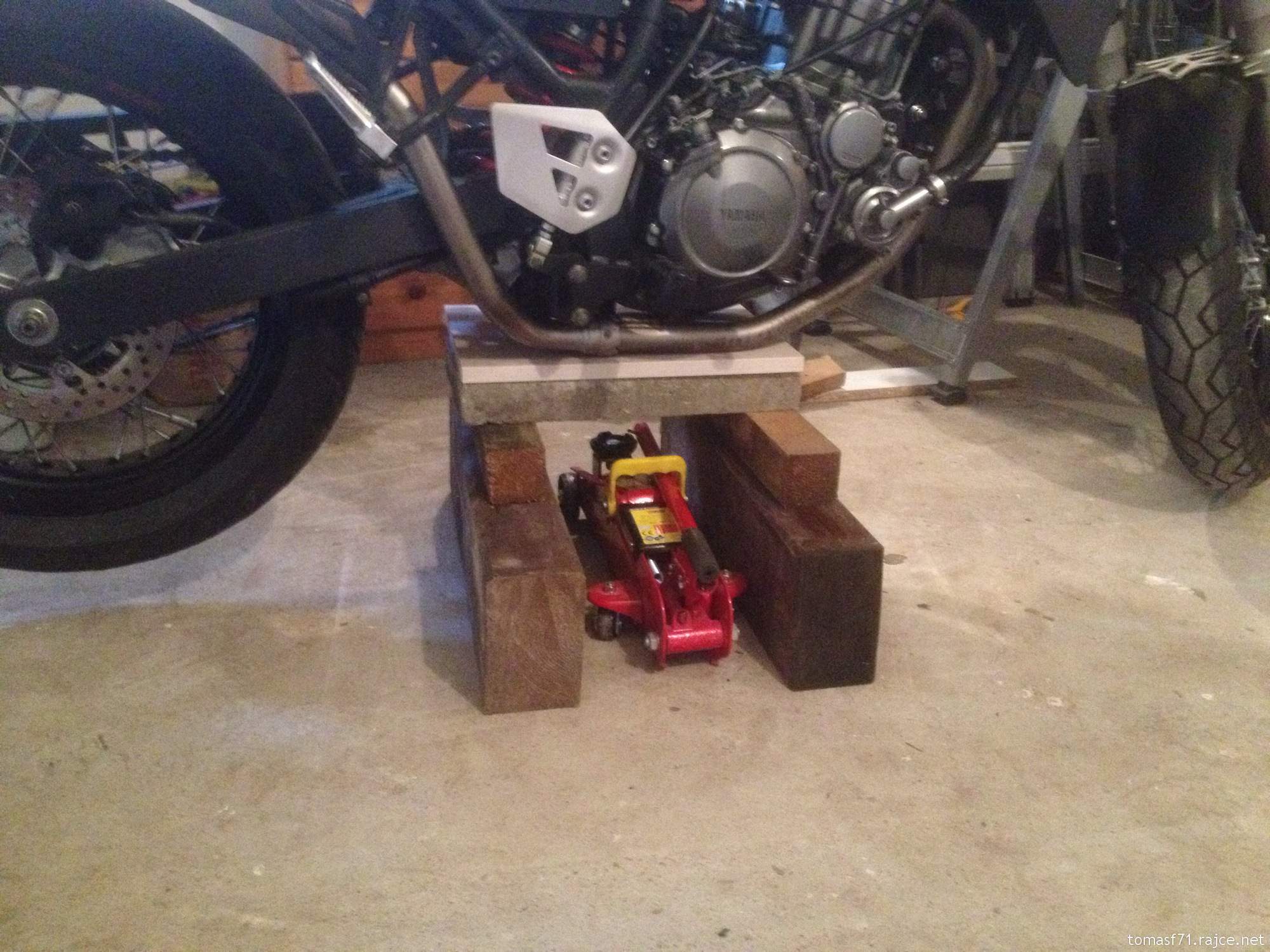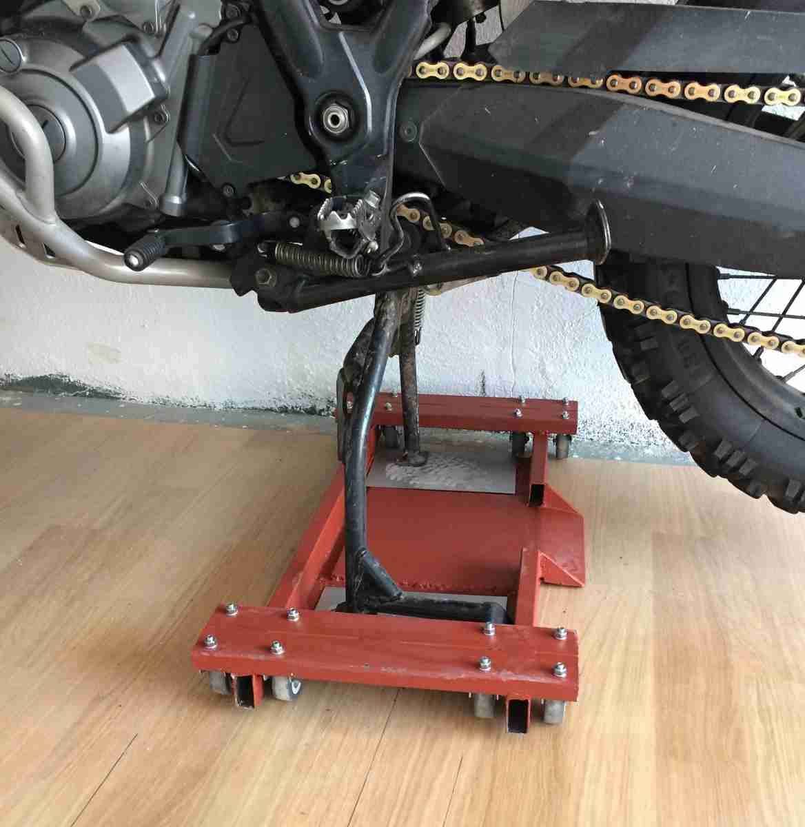 Jelikož mám málo místa v garáži, se zaparkovaným autem musí být motorka úplně u zdi na hlavním stojanu. Řešil jsem tedy, jak motorku elegantněji ke zdi a od zdi posouvat a ještě jí trochu vytočit, tak abych si už tak hroznou podlahu neničil a nedřel se jak mezek. Vyrobil jsem si tedy níže uvedený vozíček pod hlavní stojan, na kterém s motorkou manipuluji. Pokud byl hlavní stojan v těžišti motorky, byla by to pecka. Tenerka má bohužel na stojanu většinu hmotnosti na přední kolo, takže motorka má snahu se spíš kolem předního kola otáčet, což mi ale nevadí protože jí potřebuji mít i lehce vytočenou.