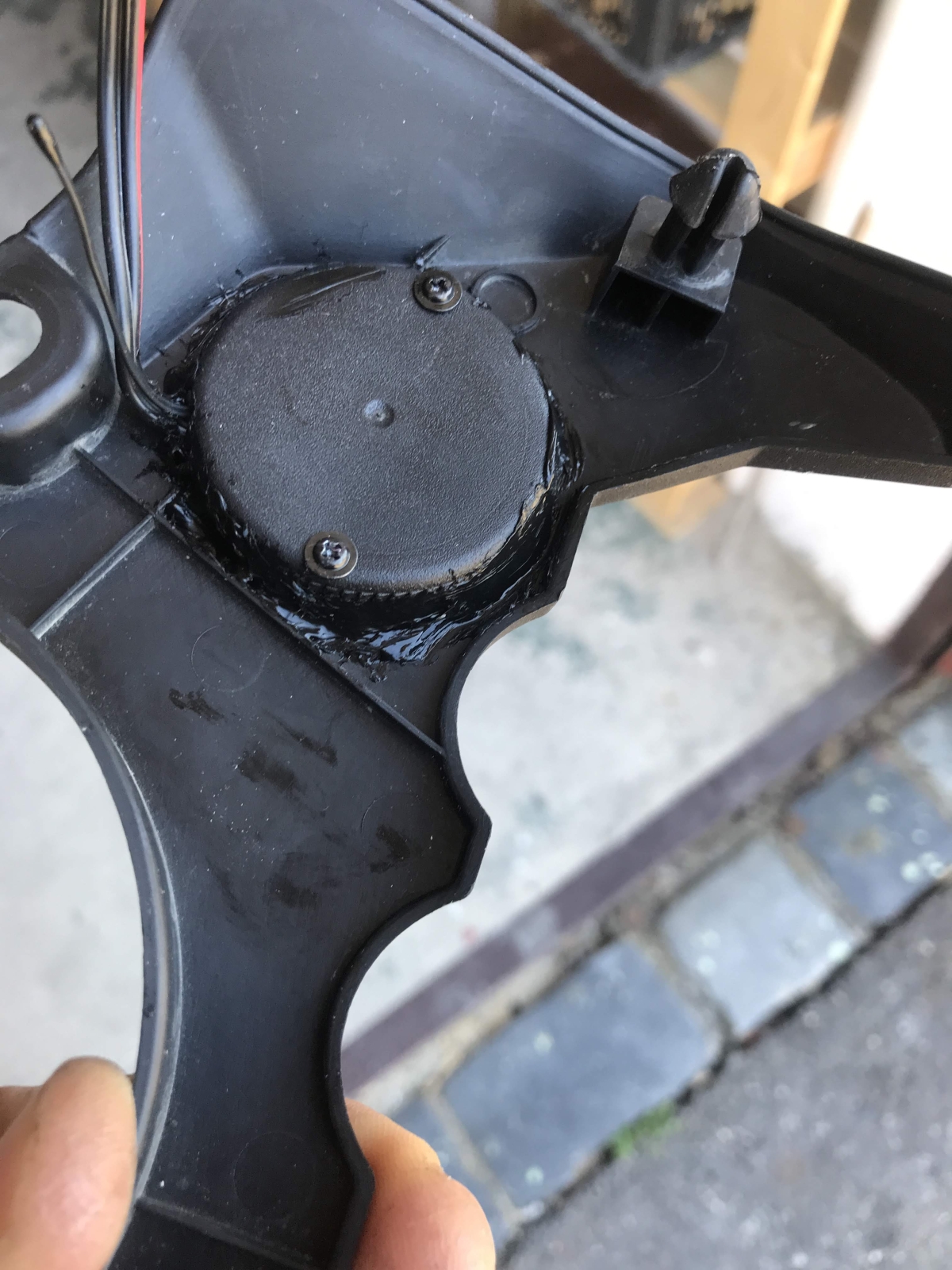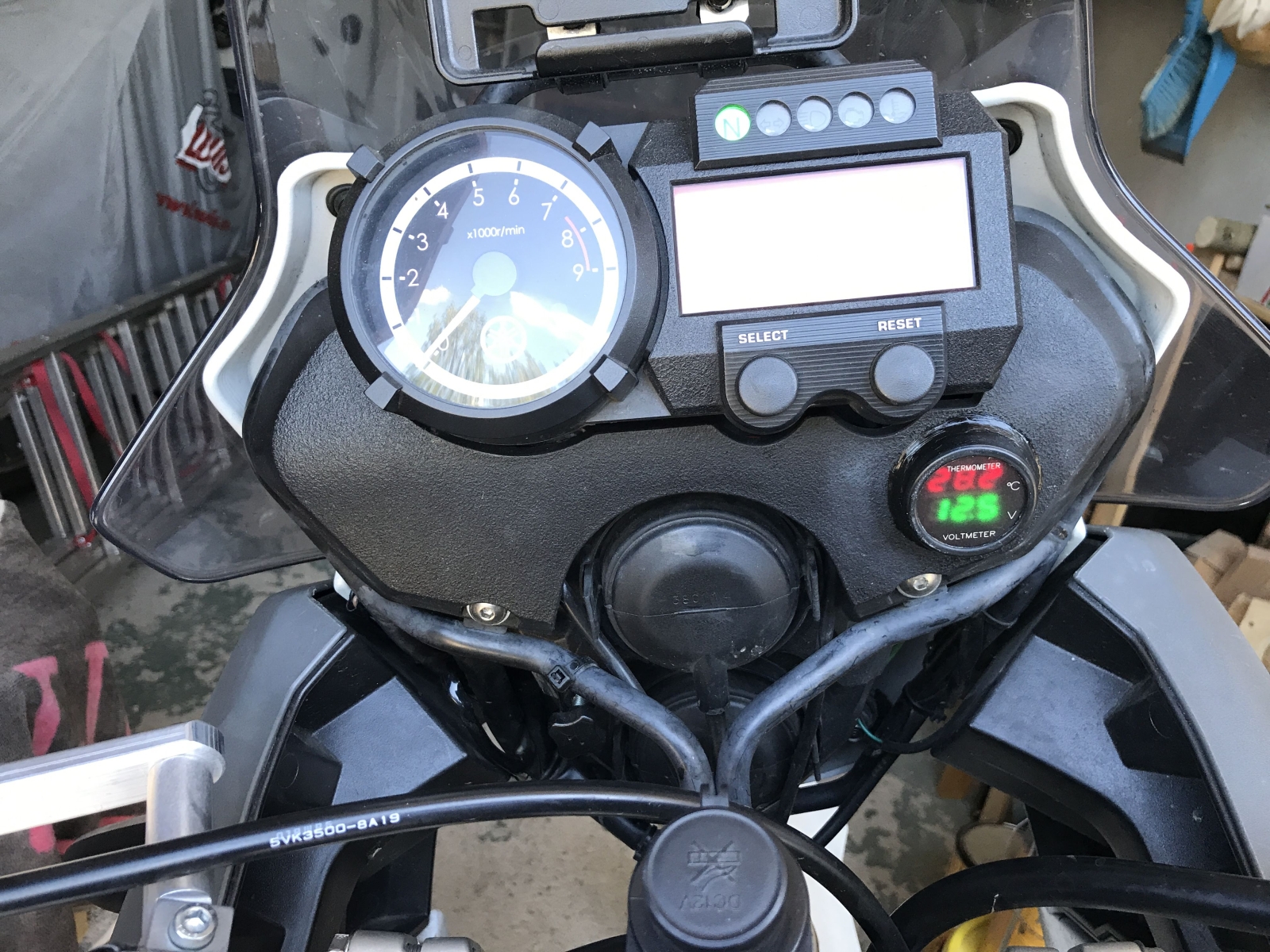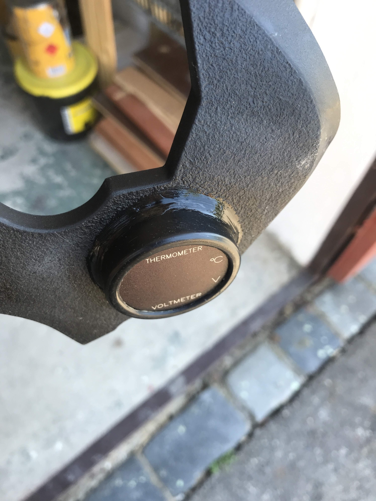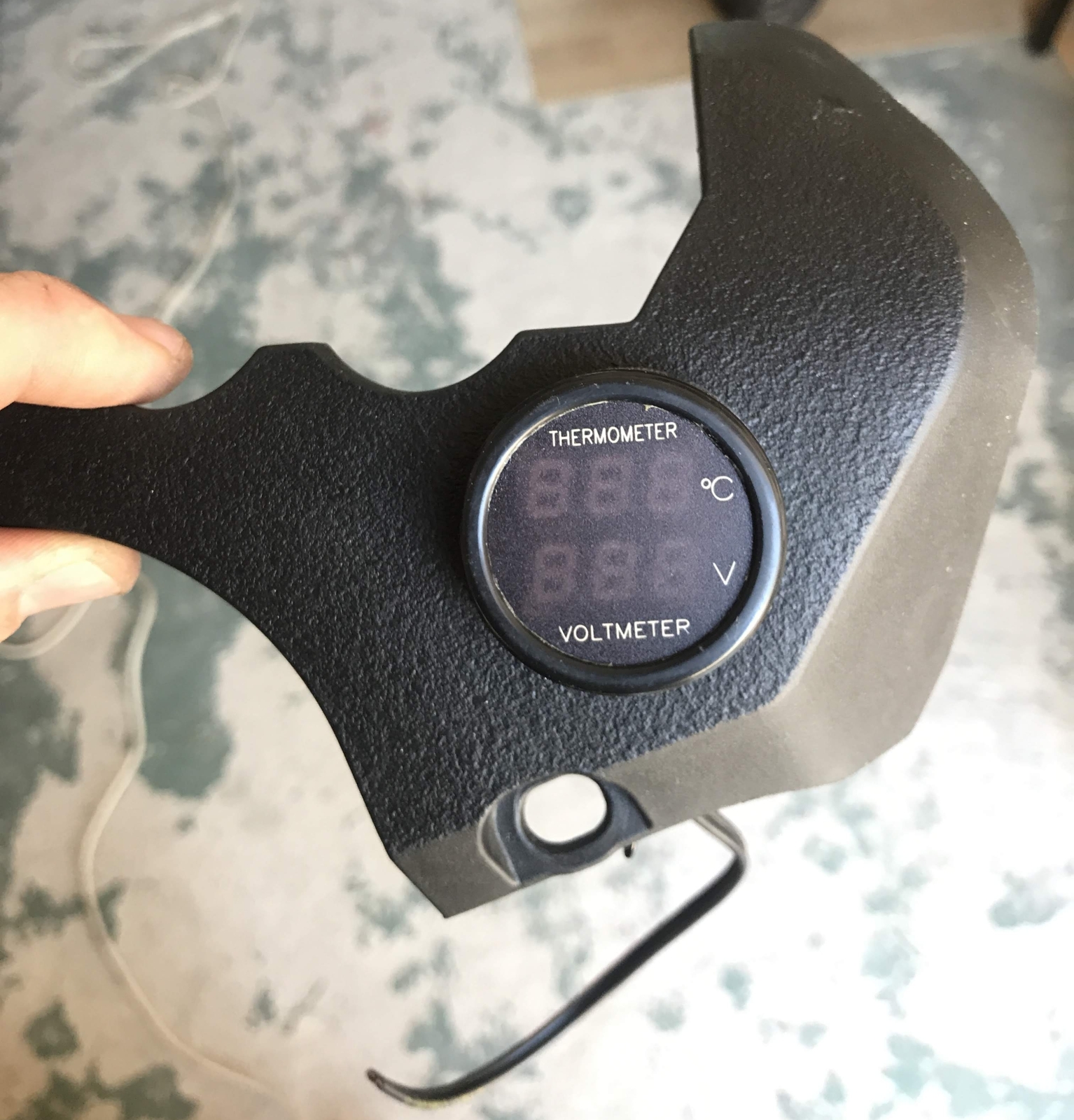 Rozebraný koupený měřák do autozásuvky. Použitý pouze vrchní díl se sklíčkem a vnitřní elektronika. zezadu jsem tišťák překryl seříznutým víčkem flašky od oleje a pro jistotu to ještě celé zapatlal silikonovým lepidlem na akvária. Napětí je přivedeno přes kabelové spojky z jedné z obrysových svítilen. Displej je trošičku zapuštěn pod sklíčkem oproti originálu a s ohledem na úhel uchycení je z pohledu řidiče velmi dobře čitelné pouze napětí, ale i ta teplota se celkem dá. Sluníčko na to nemá až takový vliv.